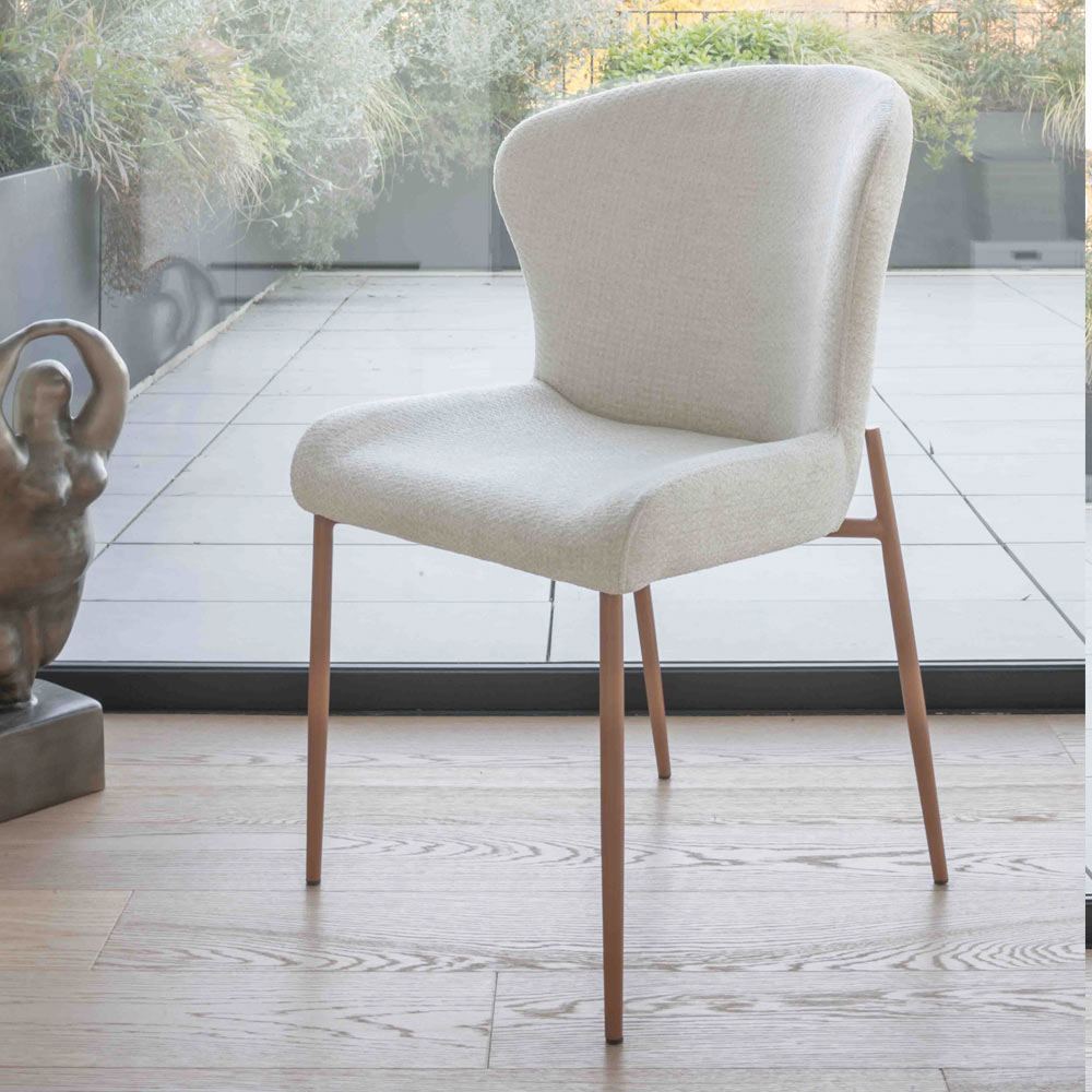 Tato židle je dokonalou kombinací pohodlí a sofistikovaného designu , ideální do moderních prostor s vytříbeným vkusem. Polstrovaný sedák a zaoblené opěradlo nabízejí ergonomickou oporu, která vybízí k relaxaci, zatímco látkové čalounění dodává místnosti nádech jasu a měkkosti . Lakované kovové nohy s štíhlým, harmonickým profilem vytvářejí elegantní kontrast s texturou látky a zdůrazňují lehkost a moderní charakter designu.