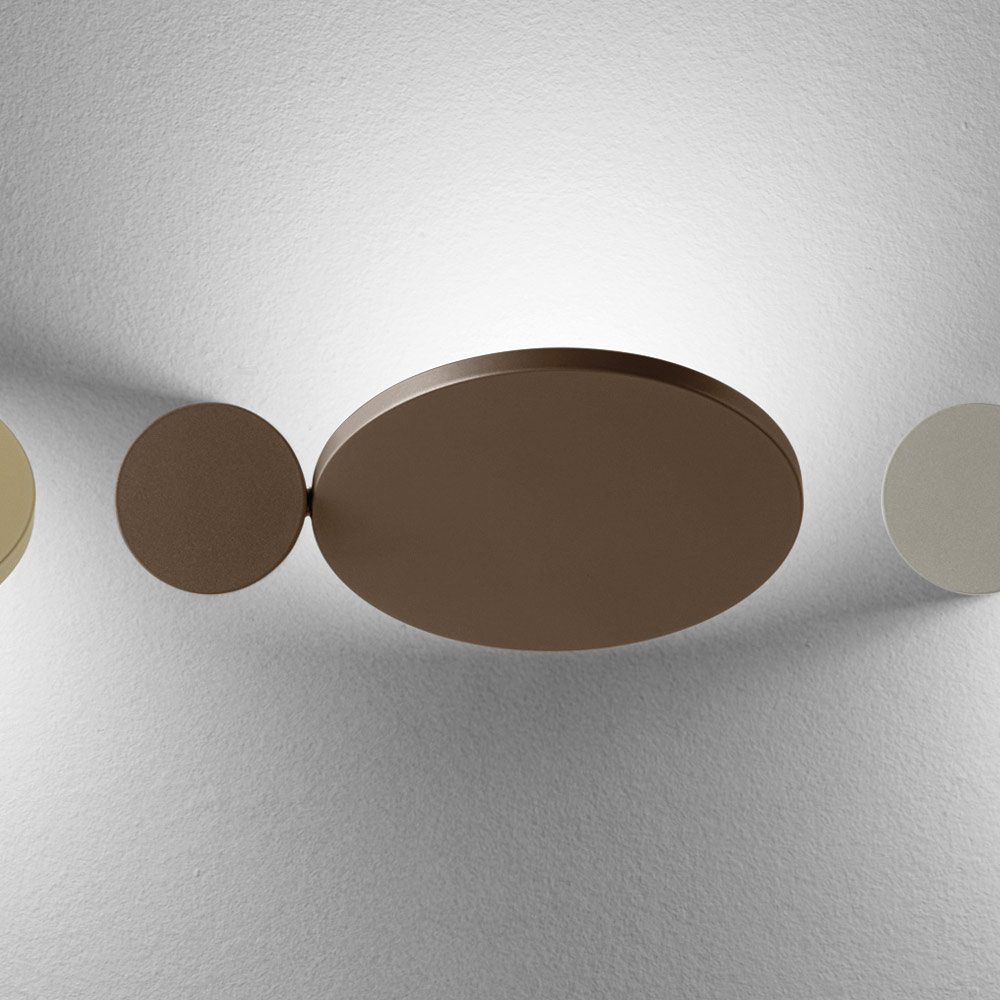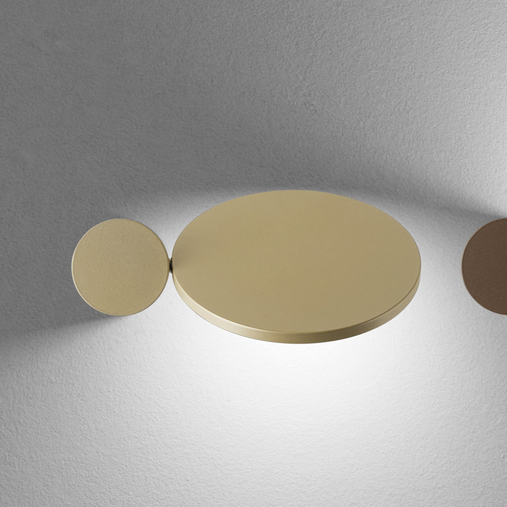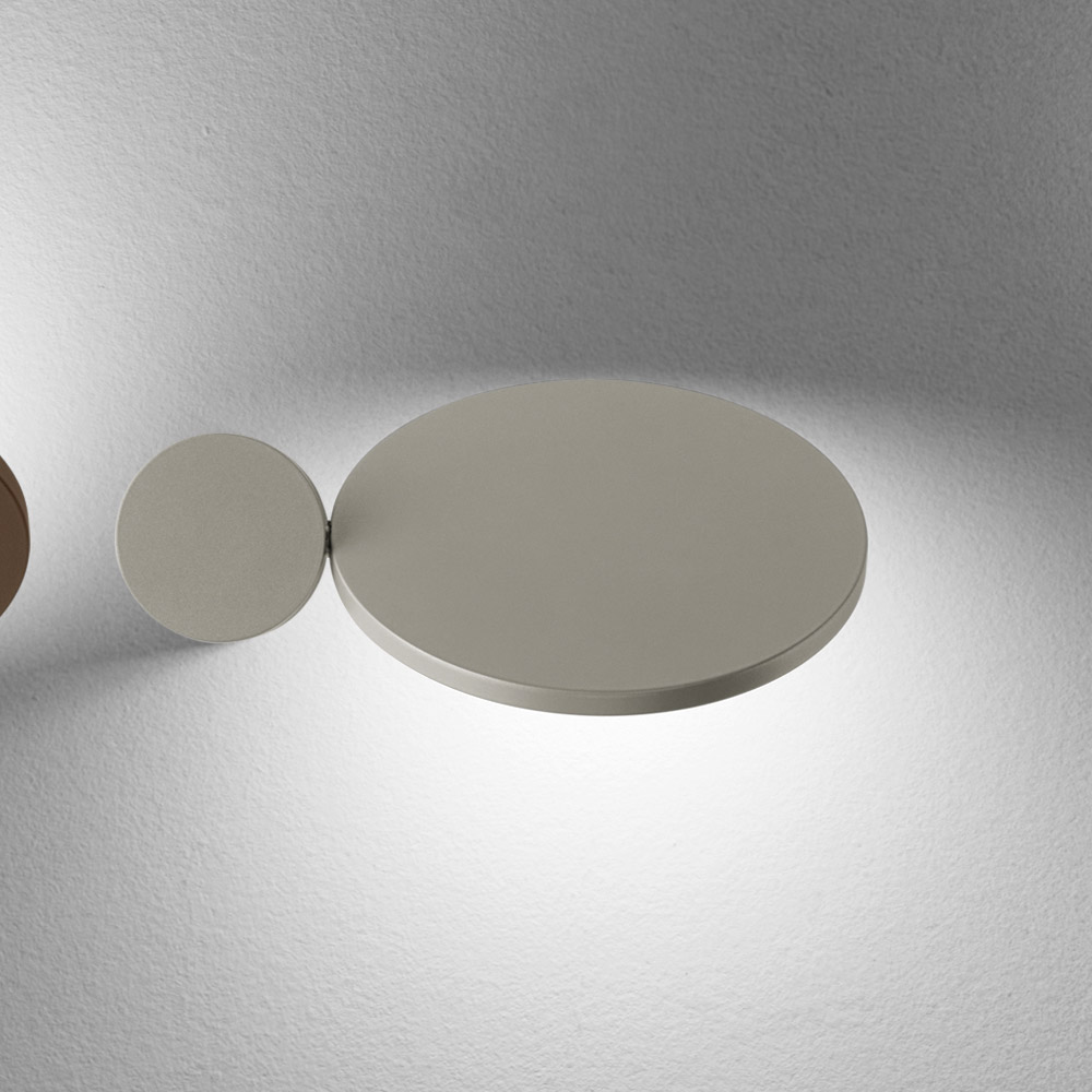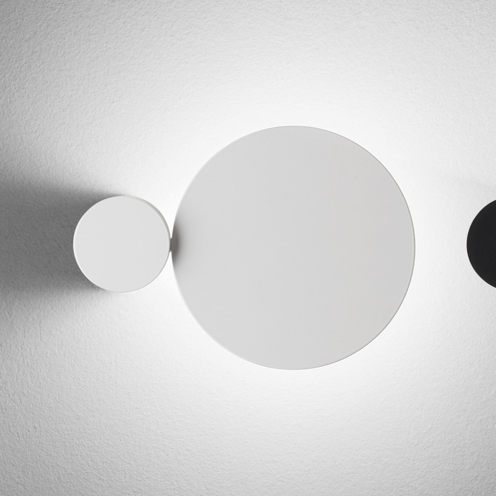 Toto nástěnné svítidlo je skutečným světelným uměleckým dílem , které v jednom gestu spojuje grafický design a dekorativní funkci . Skládá se ze základních geometrických tvarů a hraje si s překrývajícími se disky a ovály , které po zapnutí vytvářejí na zdi jemný a dramatický světelný efekt.