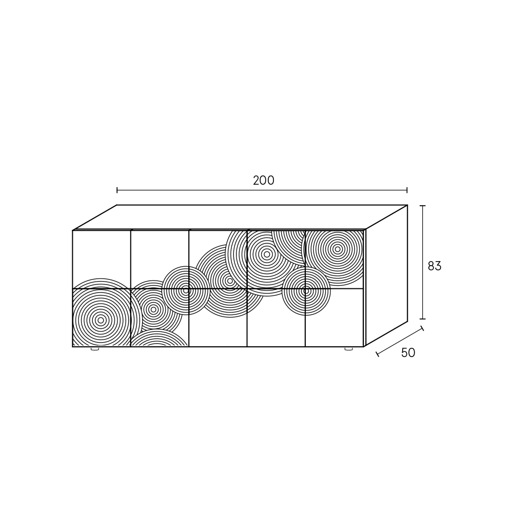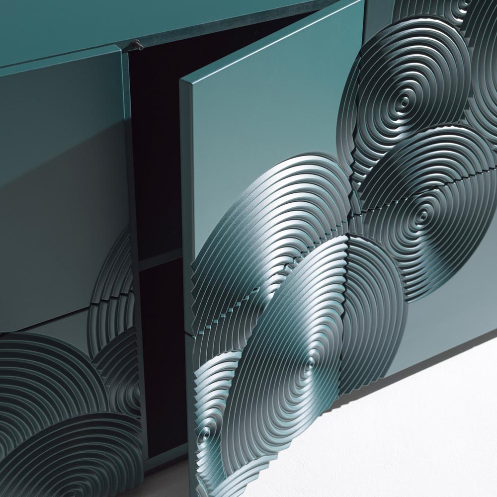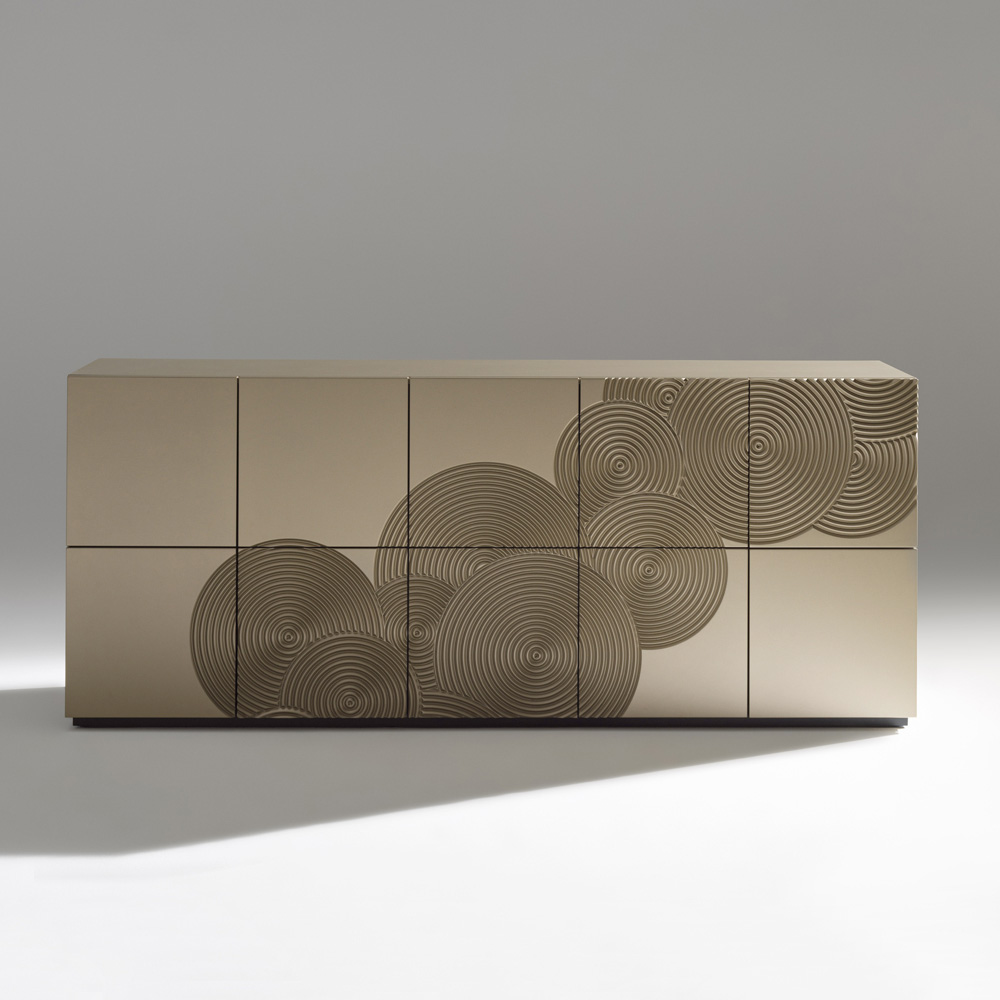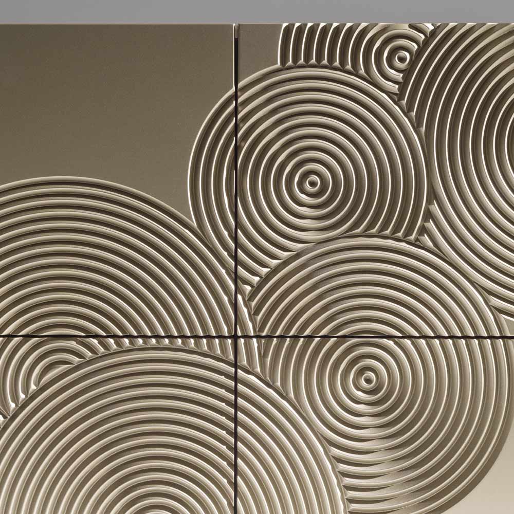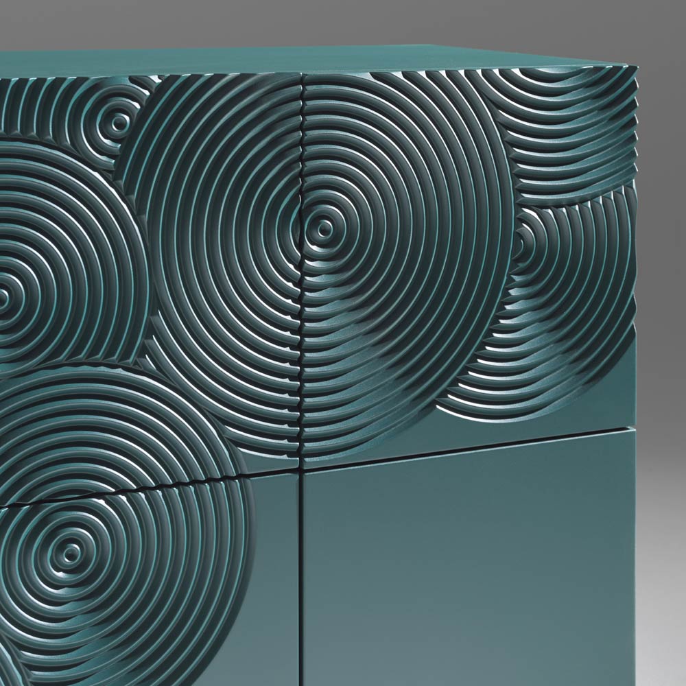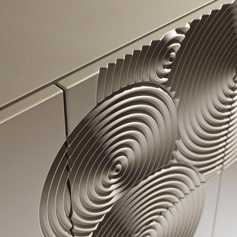 Příborník se silným vizuálním dopadem, charakterizovaný rafinovanou dekorací s rytým kruhovým motivem a kompletně ručně dokončený , schopný vytvářet na povrchu sugestivní hry světla a stínu.