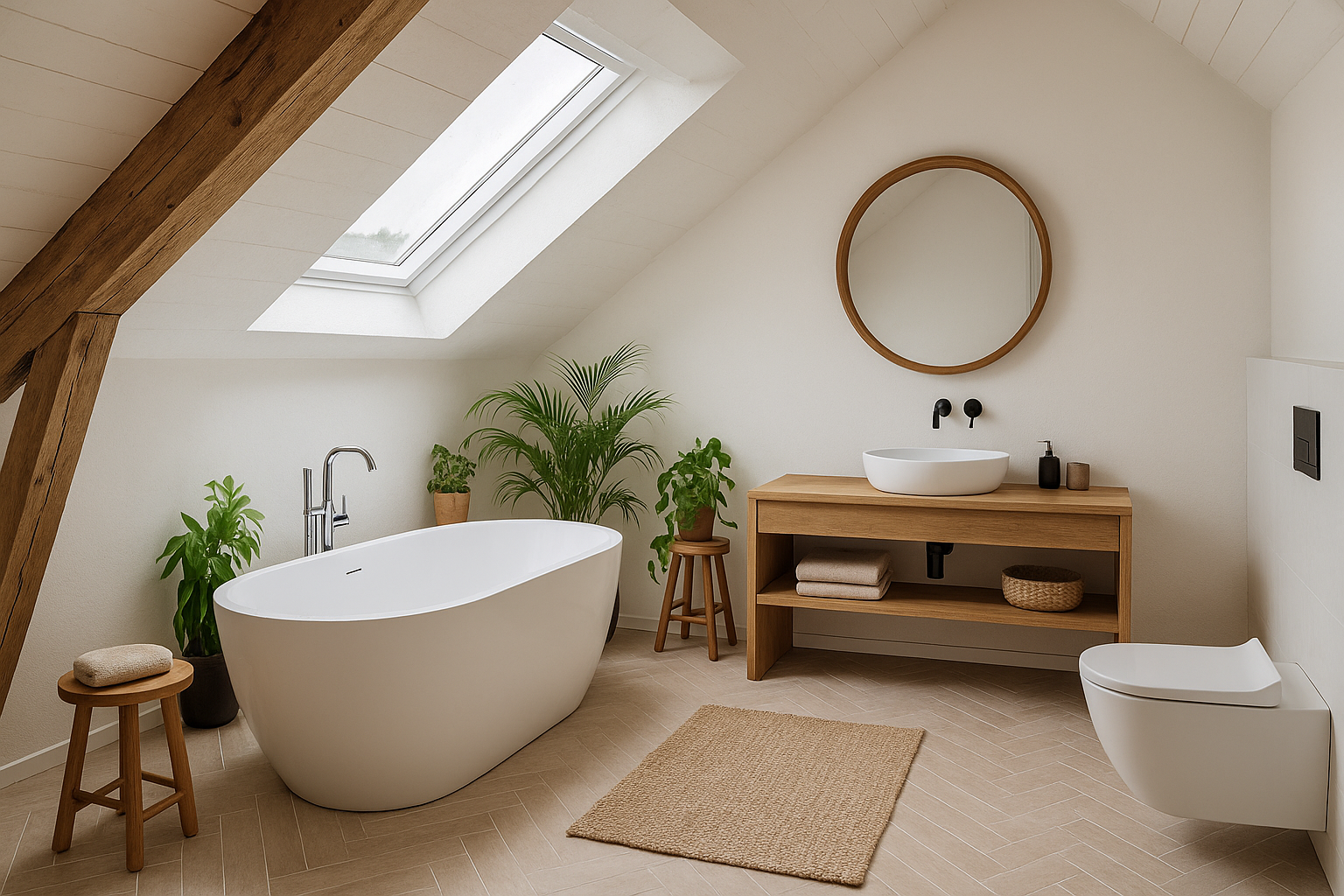 V podkroví je světlo vším . Pokud máte střešní okno, využijte ho na maximum. Ale skutečný dotek stylu? Systém vrstveného osvětlení. Vzpomeňte si na nástěnná svítidla s rámem z kartáčované mosazi , ručně vyrobená v Itálii, která vytvářejí teplé a přívětivé odrazy. Ano, dokonce i v koupelně.