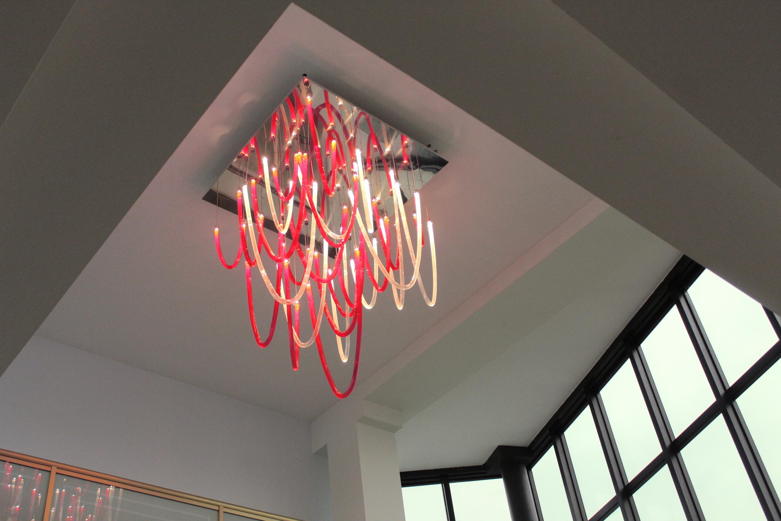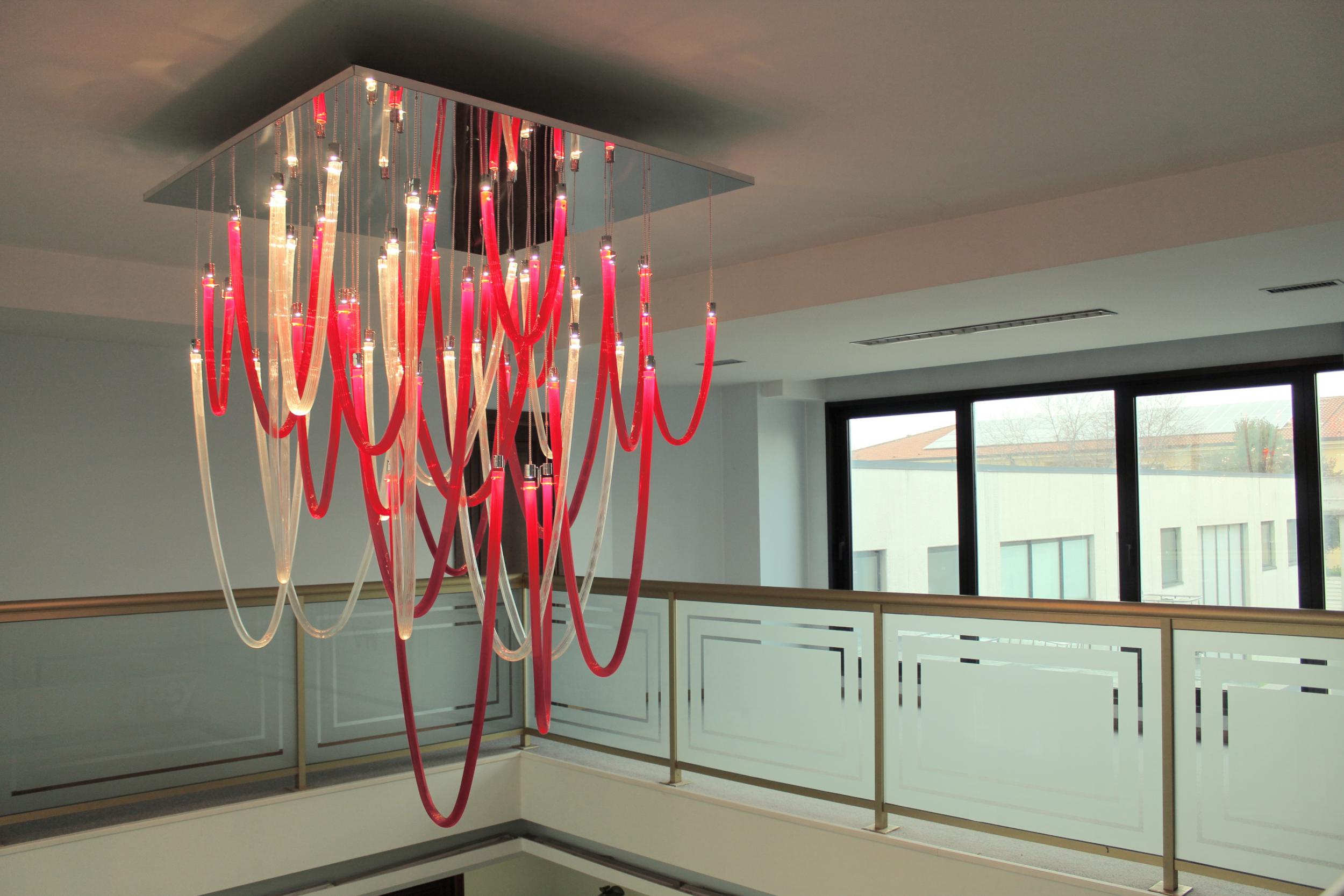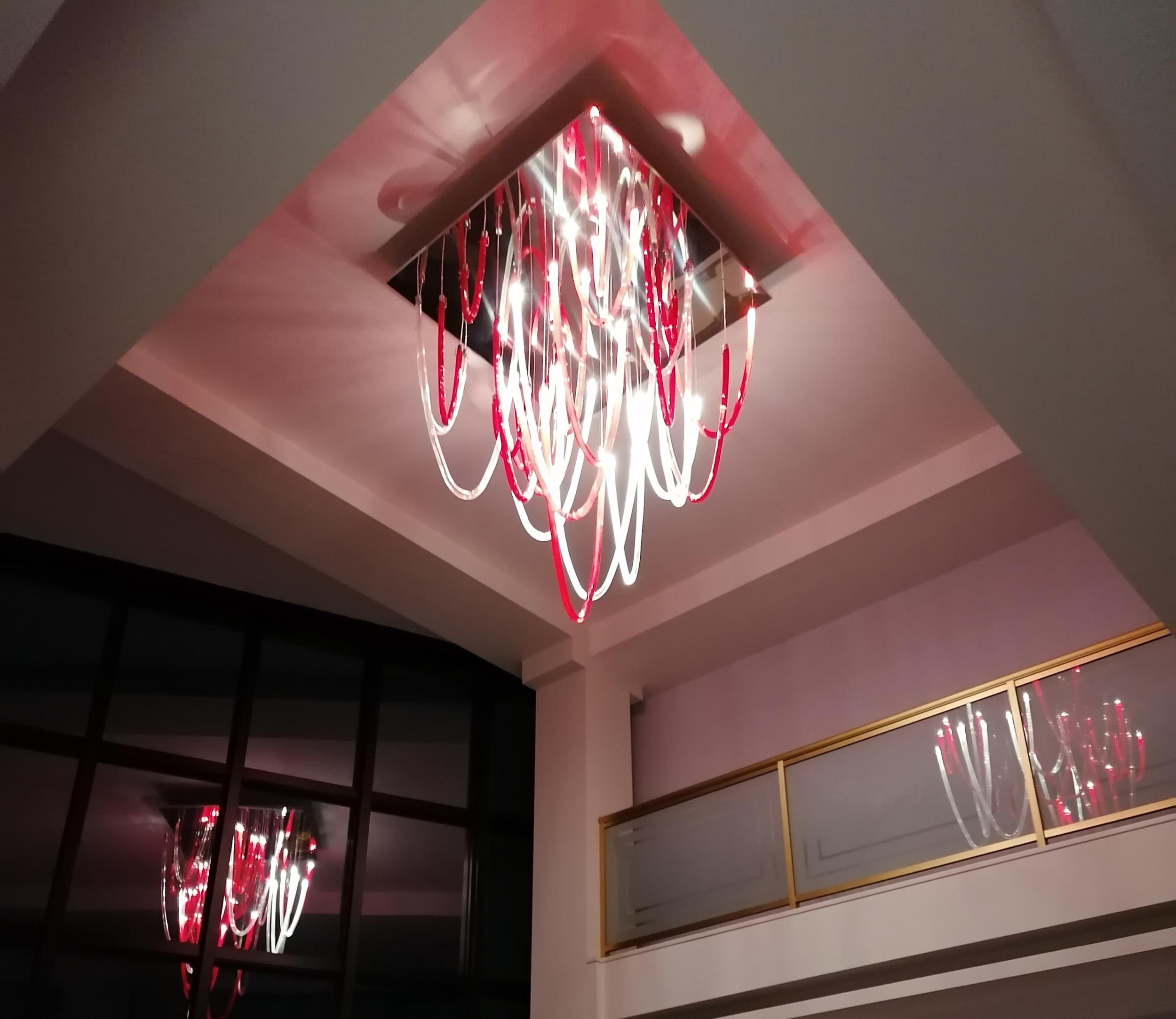 Majestátní a elegantní má čtvercovou základnu se stranou 140 cm, ze které jemně sestupují foukané skleněné prvky s tenkými žebry osvětlenými LED. Celková výška lustru je 220 cm. Elegantní a přívětivé je světlo, které se tyto diody LED šíří přes červené a průhledné sklo, které tvoří celý lustr, který jsme si vybrali. Nezapomeňte však, že se tato lampa hodí také k přizpůsobení barev a velikostí.