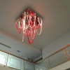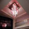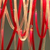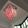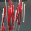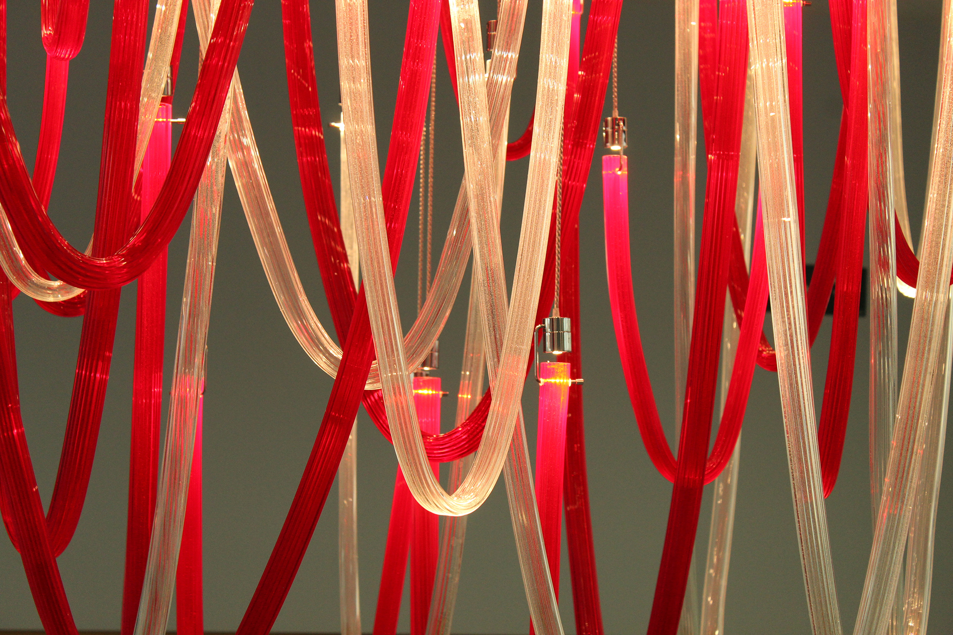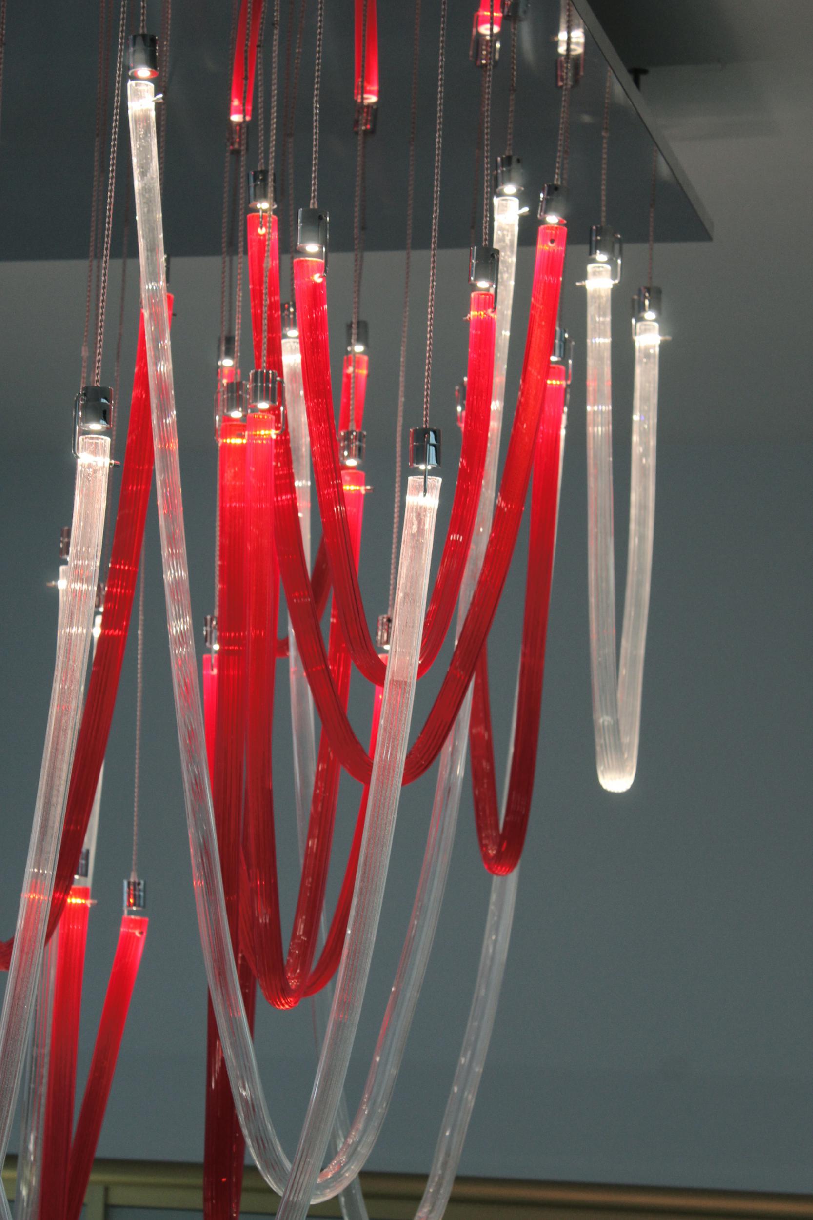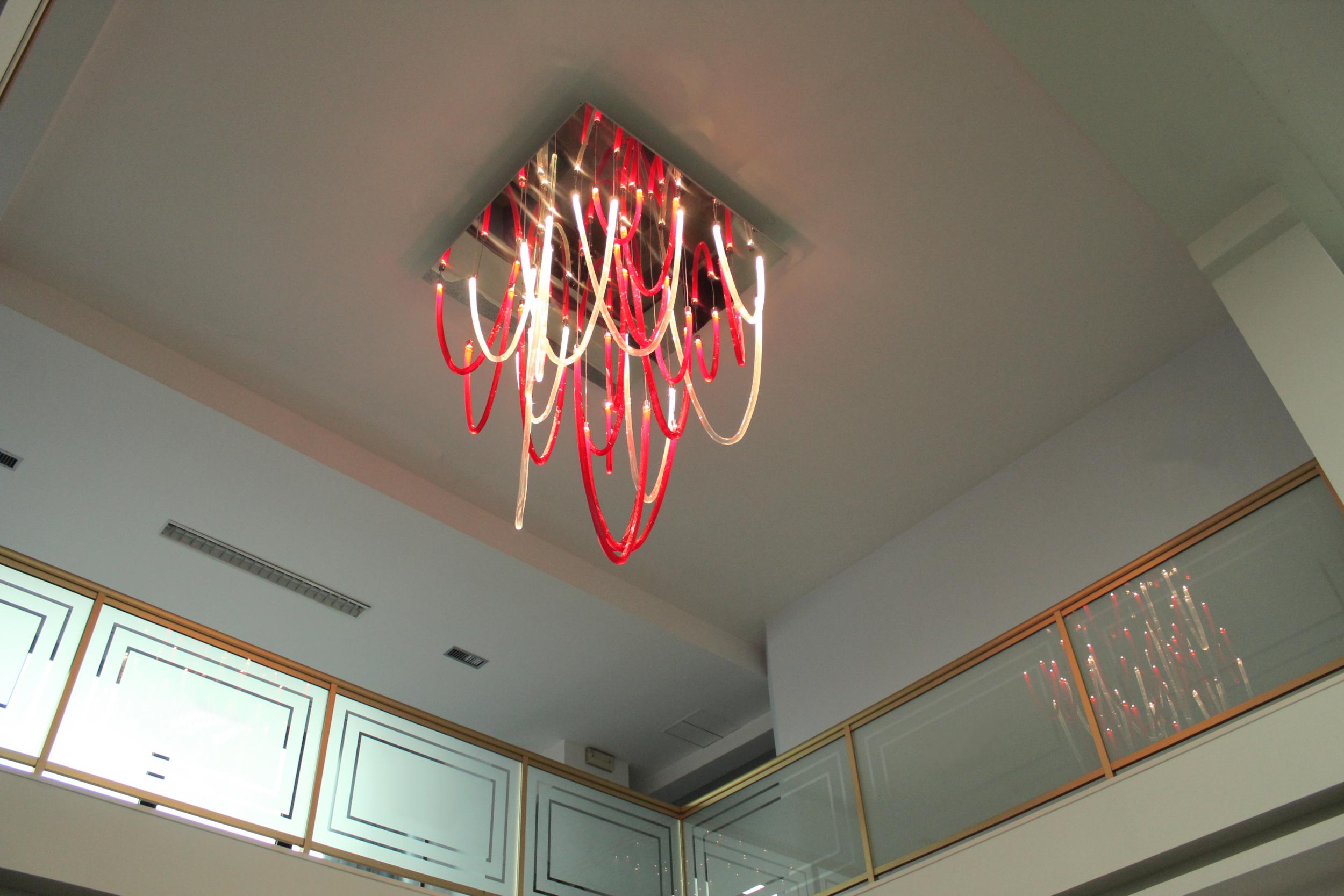 Majestátní a elegantní má čtvercovou základnu se stranou 140 cm, ze které jemně sestupují foukané skleněné prvky s tenkými žebry osvětlenými LED. Celková výška lustru je 220 cm. Elegantní a přívětivé je světlo, které se tyto diody LED šíří přes červené a průhledné sklo, které tvoří celý lustr, který jsme si vybrali. Nezapomeňte však, že se tato lampa hodí také k přizpůsobení barev a velikostí.