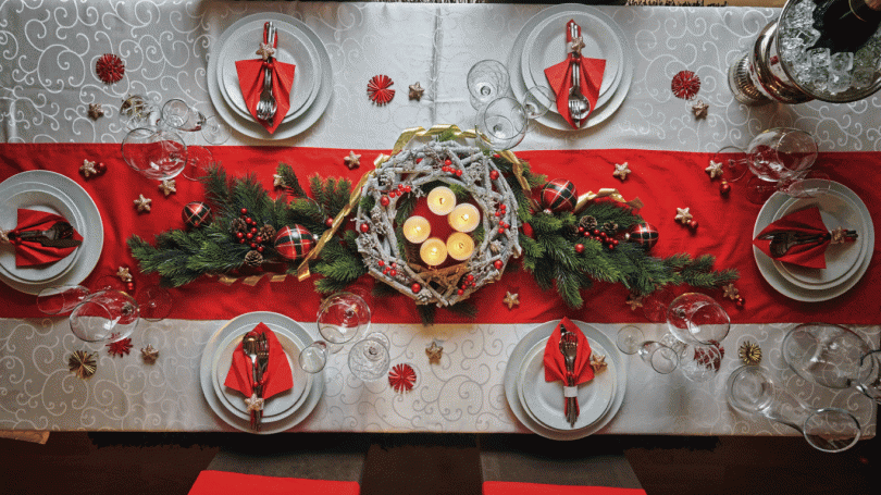 Ubrus obléká stůl a je bezpochyby základním prvkem k obnovení základu vánoční atmosféry během oběda. Ubrus bílý nebo barevný, vyšívaný nebo s potisky (pokud to nepřehánějí), musí být čistý a dobře žehlený, mít správné rozměry (proto musí klesnout alespoň o 30 cm na každou stranu, aby nedocházelo k efektu „příliš krátké deky“) a respektujte tvar stolu (bude tedy obdélníkový, pokud je stůl obdélníkový, kulatý, pokud je kulatý atd ...). U látky bude výběr mezi bavlnou a lnem, což jsou ty nejoblíbenější a nejprestižnější a nejelegantnější.