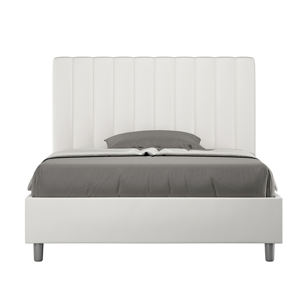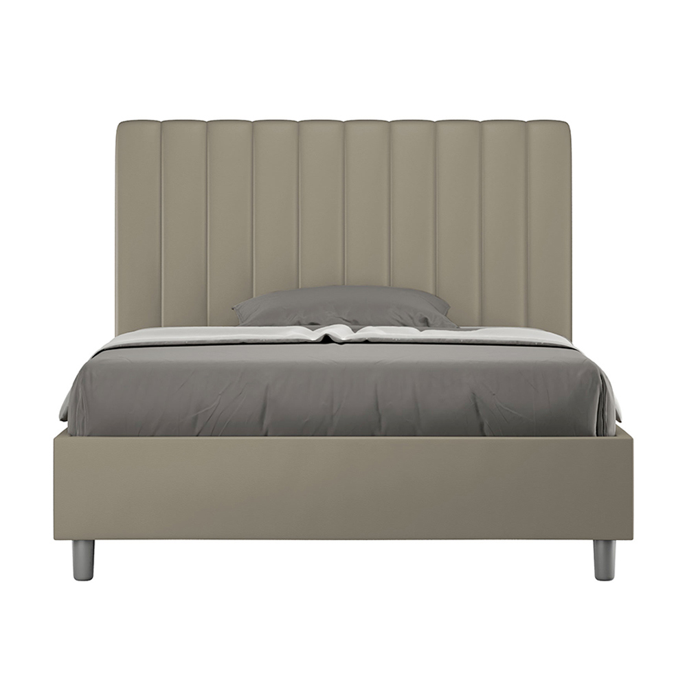 Francouzská postel 140x200 cm s čalouněním z melaminových panelů a potahem z imitace kůže , vyrobená výhradně v Itálii. Tato francouzská postel s čalouněným rámem je ideální pro ty, kteří hledají výrazný kousek postele, aniž by byl příliš dominantní. Postel se pyšní minimalistickým čelem s jemným prošívaným efektem symetrických svislých linií , které se krásně hodí do jakéhokoli prostředí, ať už moderního nebo klasického. Čalounění z umělé kůže dodává místnosti teplý a příjemný pocit.