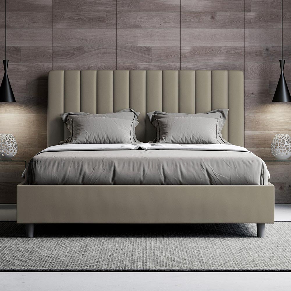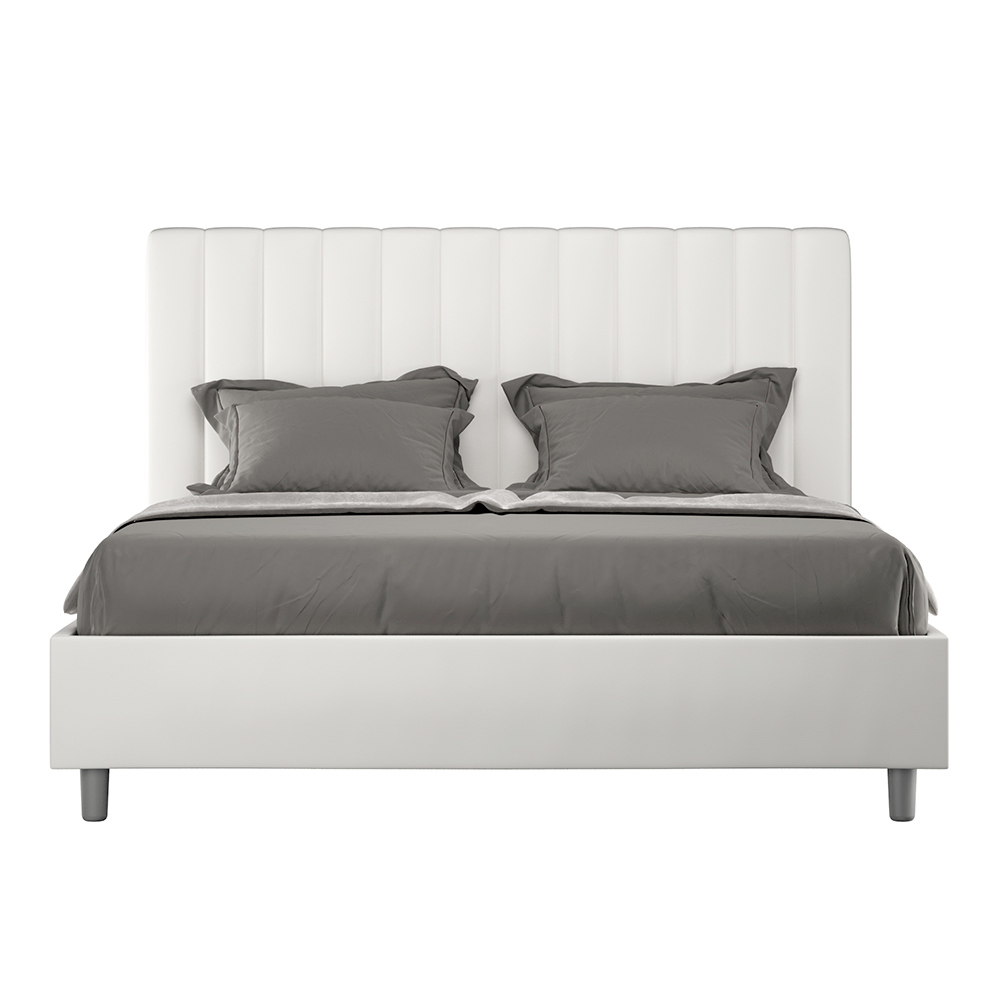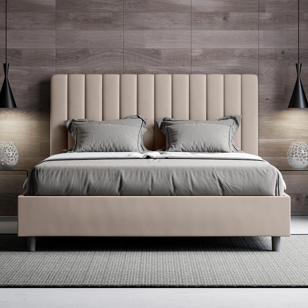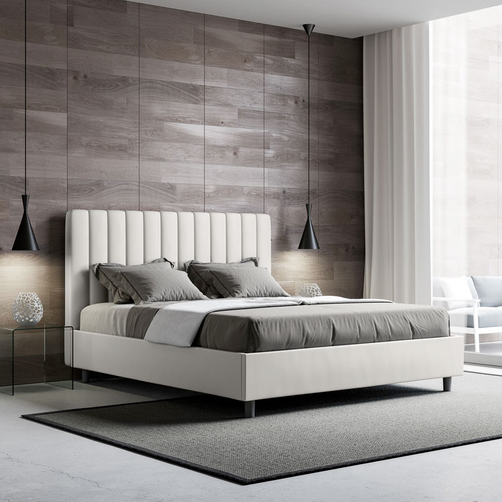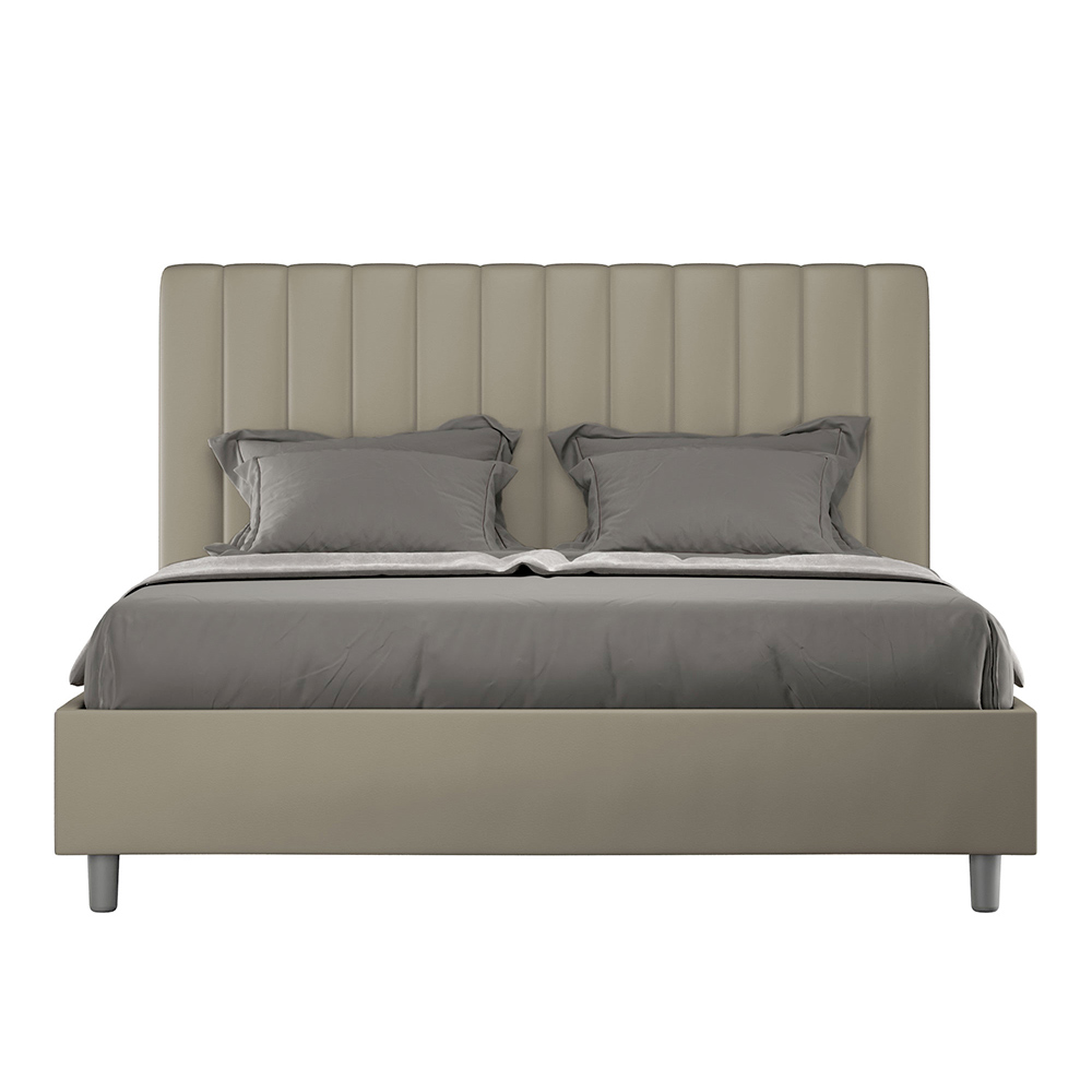 Čalouněná manželská postel o rozměrech 160x200 cm vyrobená z dřevotřískových panelů a potažená imitací kůže , kompletně vyrobená v Itálii. Tato manželská postel s čalouněným rámem je ideální pro ty, kteří hledají výrazný kousek postele, aniž by byl příliš dominantní. Postel se pyšní minimalistickým čelem s jemným prošívaným efektem symetrických svislých linií , které se krásně hodí do jakéhokoli prostředí, ať už moderního nebo klasického. Čalounění z umělé kůže dodává místnosti teplý a příjemný pocit. Je obzvláště vhodná do dobře osvětlených prostor, protože materiál si zachovává svou barvu i po delším vystavení slunečnímu záření.