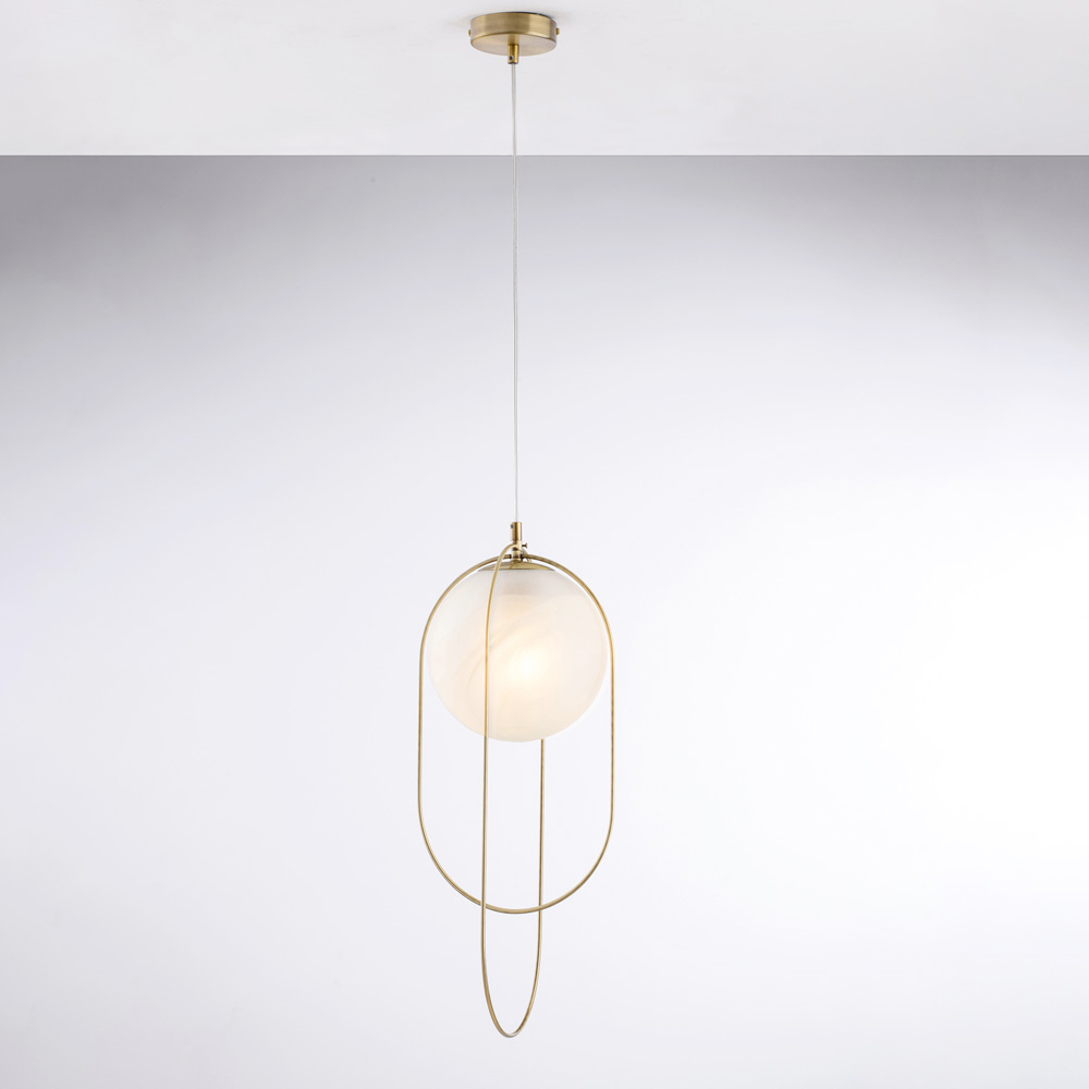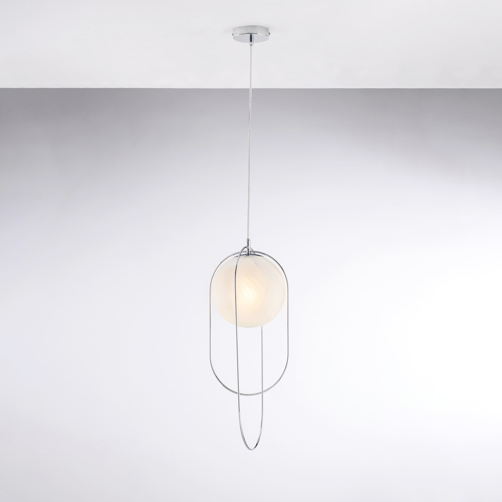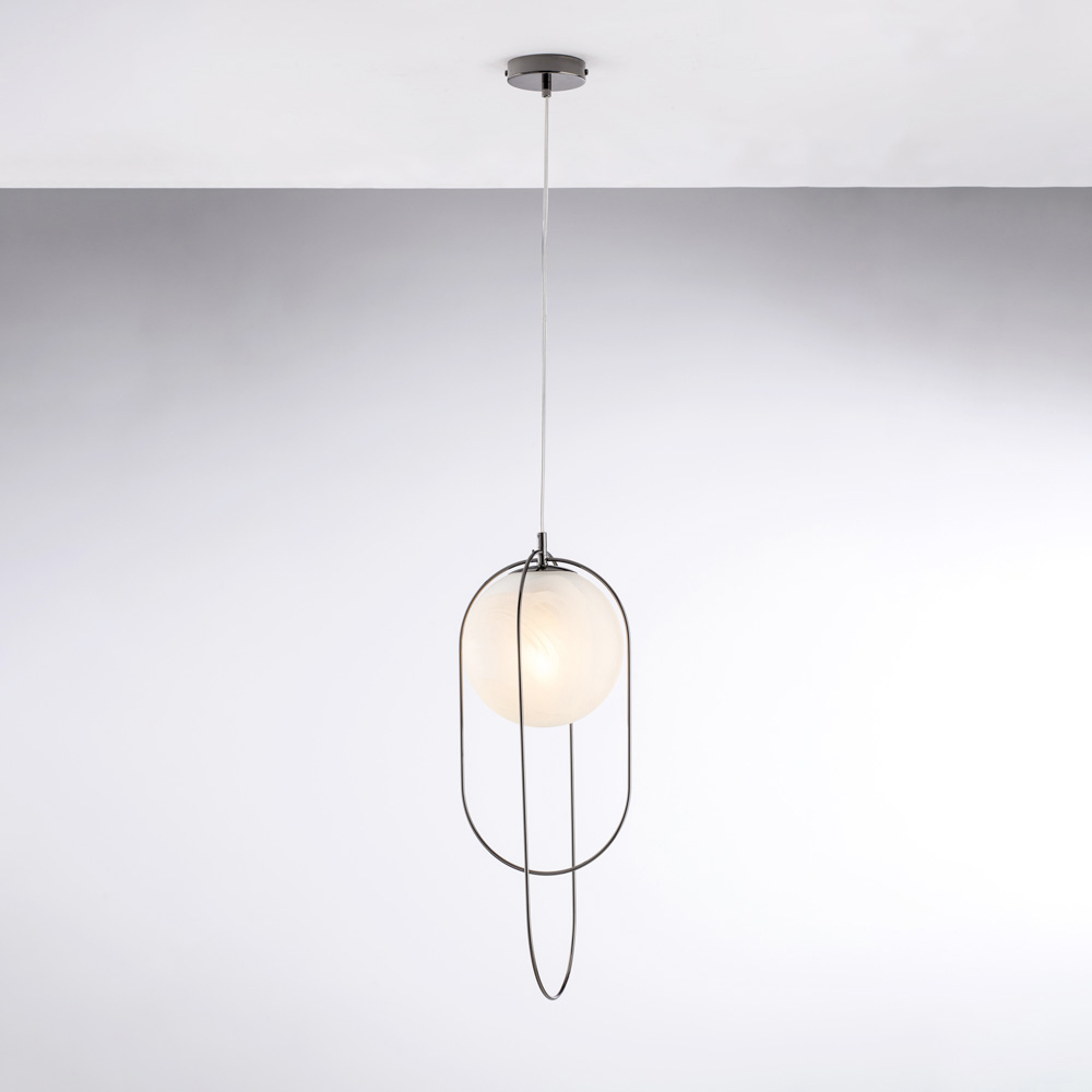 Toto jednoduché a sofistikované designové železné závěsné svítidlo se skleněnou koulí je moderním řešením osvětlení určeným pro ty, kteří oceňují čisté linie a decentní eleganci. Štíhlá kovová konstrukce ukrývá světelnou kouli o průměru 20 cm , která vytváří rafinovanou rovnováhu mezi formou a světlem.