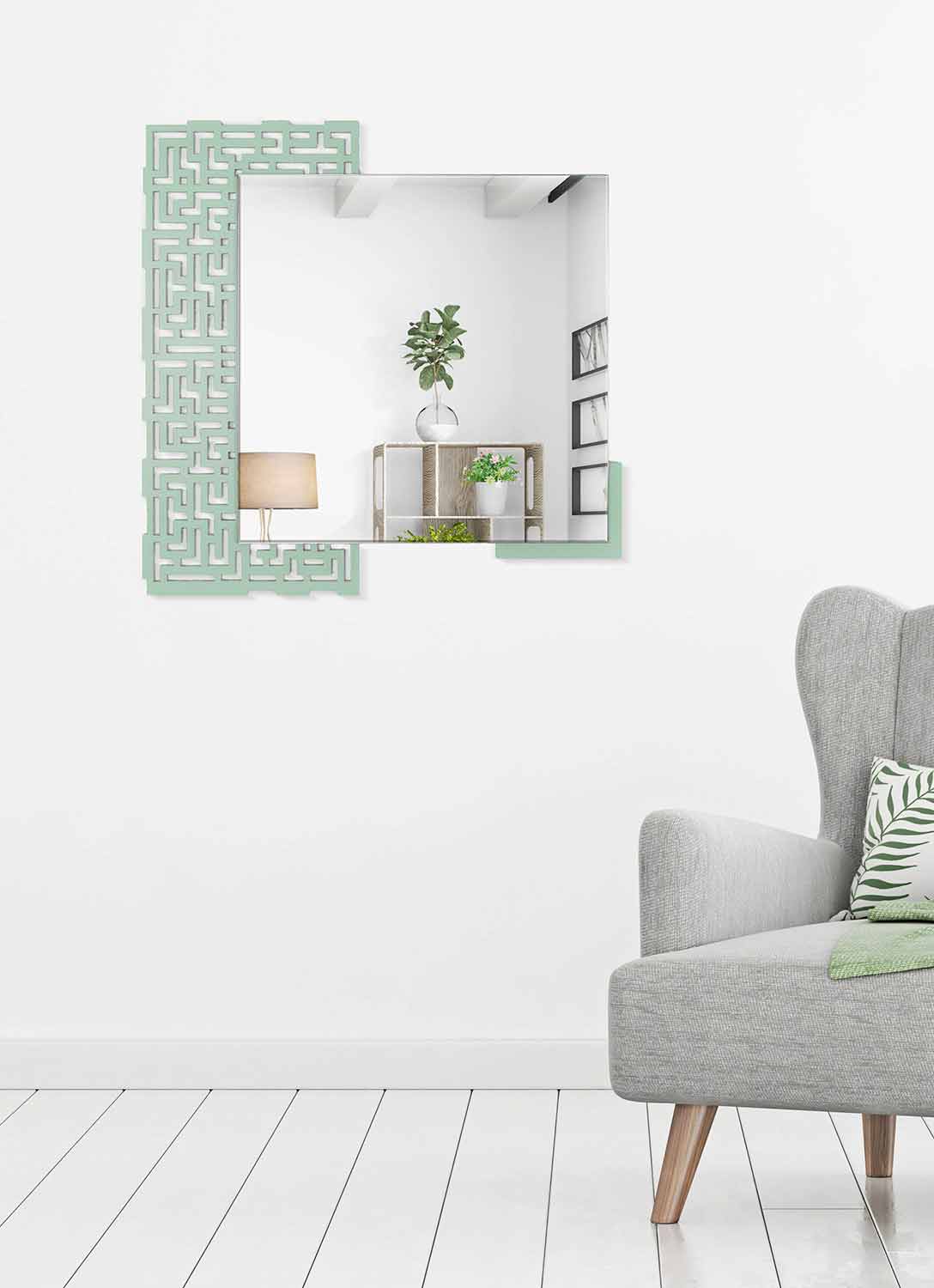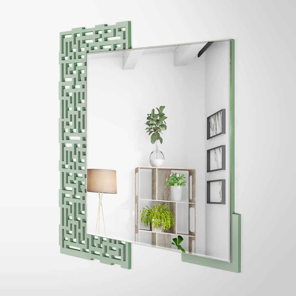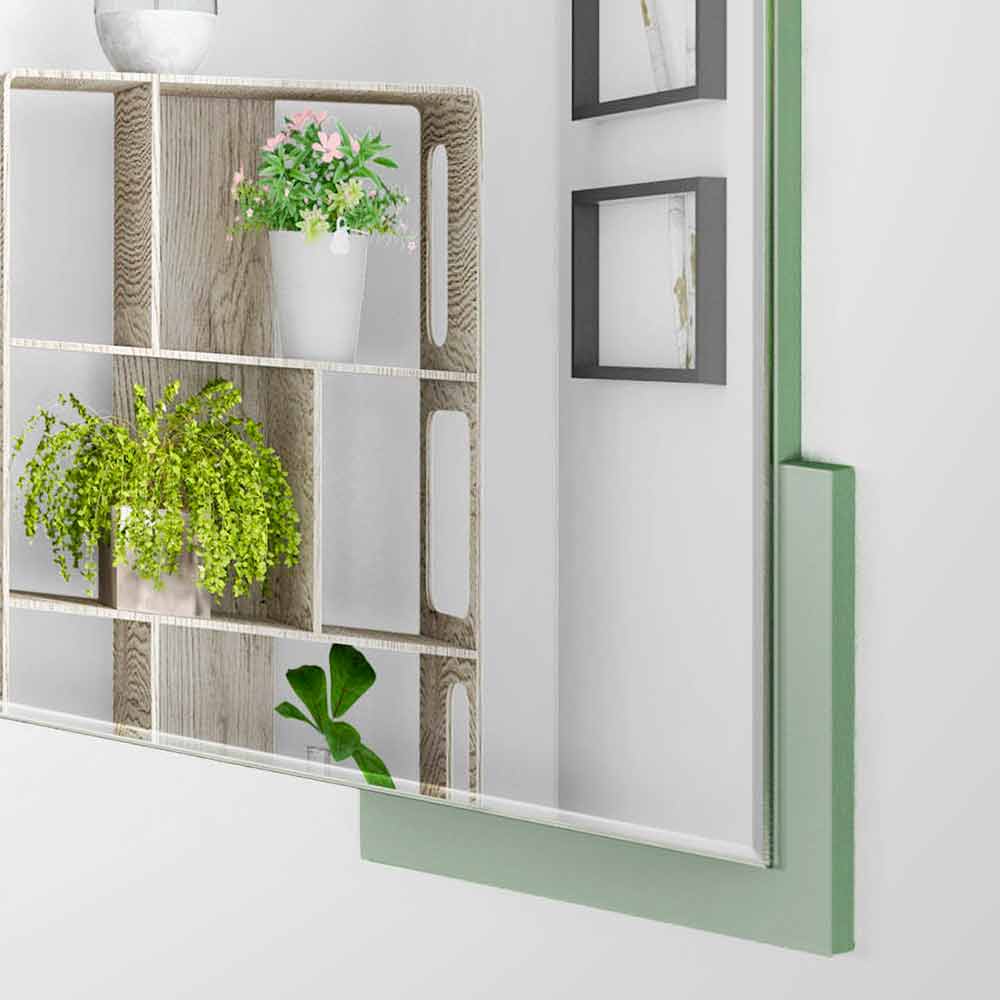 Moderní nástěnné zrcadlo, čtvercový geometrický design, v zeleném dřevě a vyrobené v Itálii.