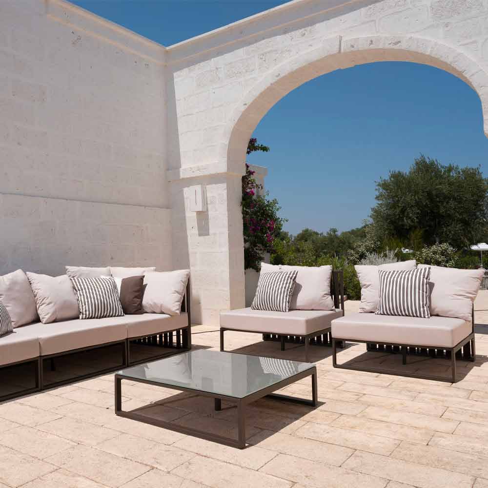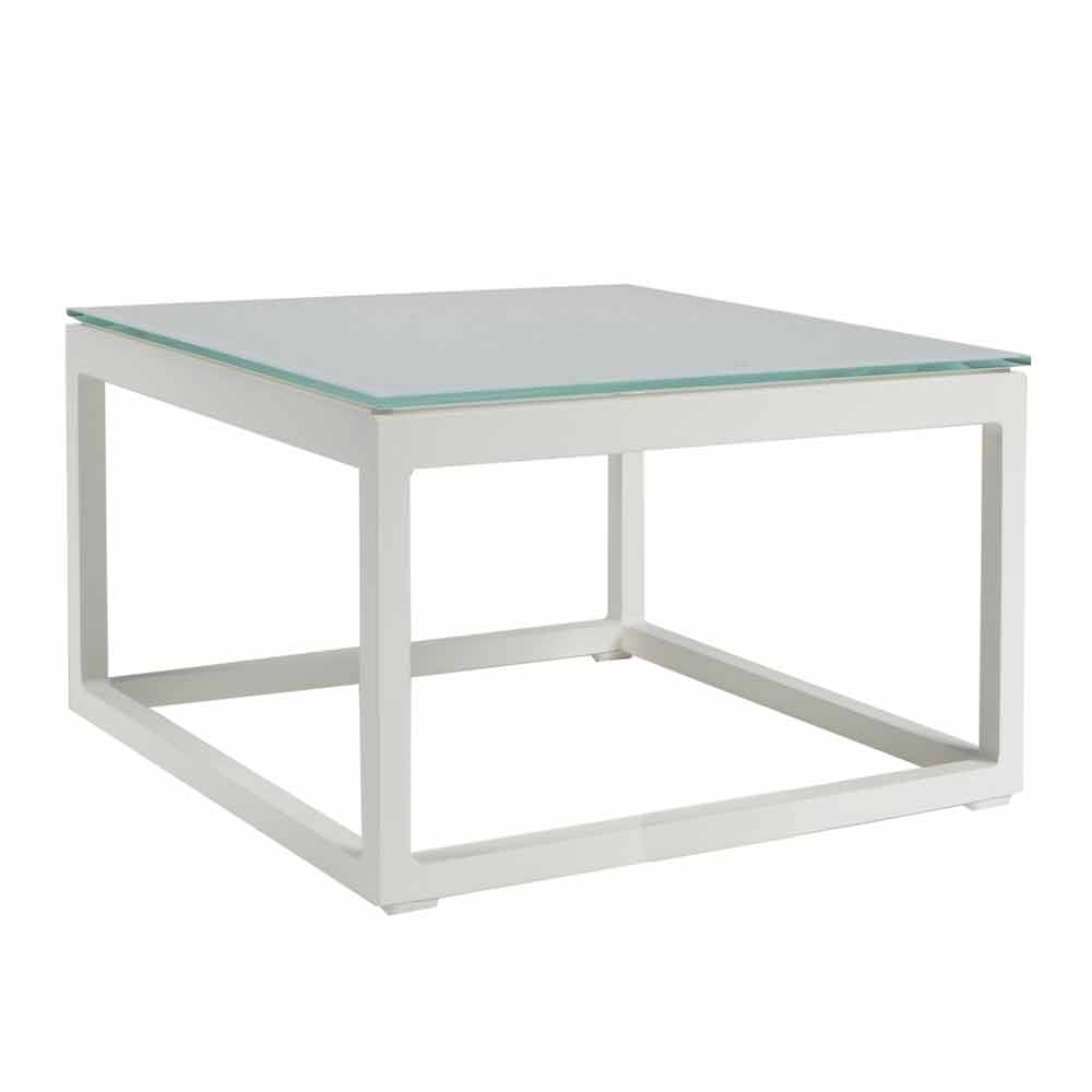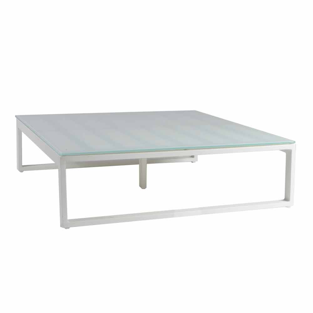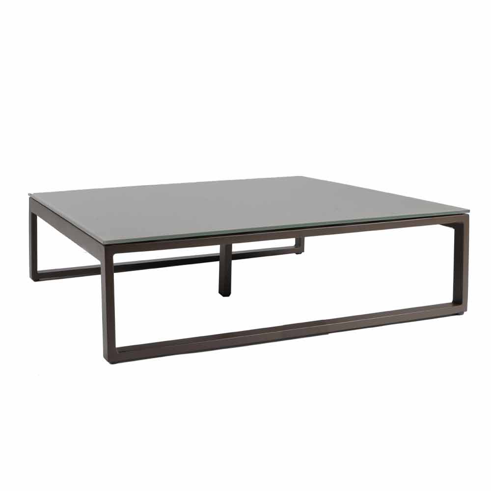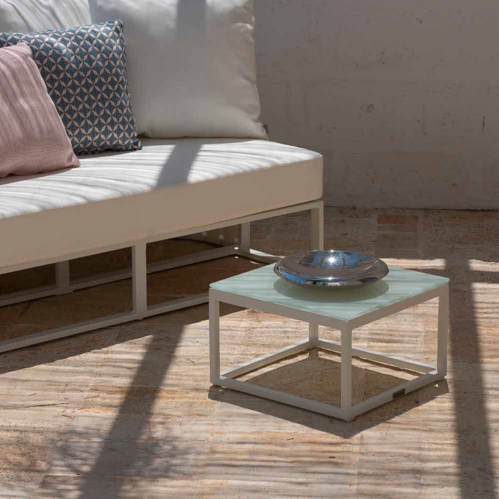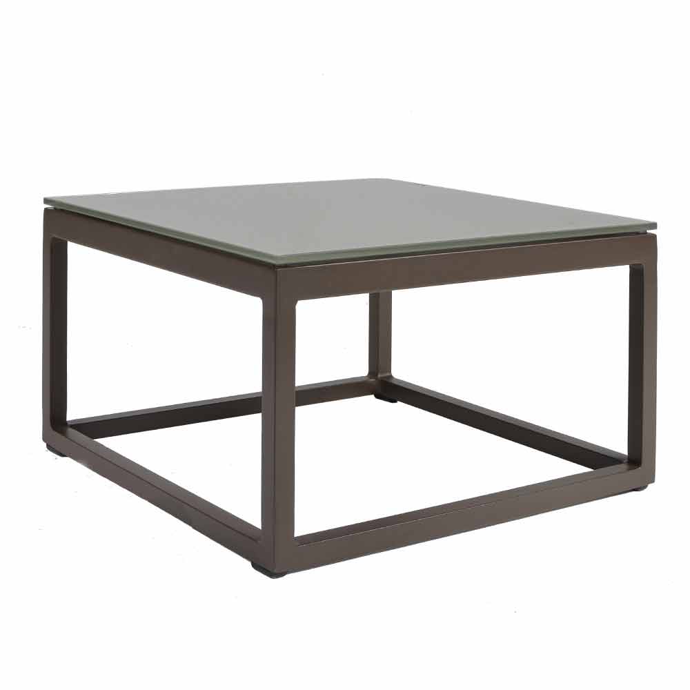 Nízký venkovní stůl s hliníkovou strukturou ve 3 povrchových úpravách a čtvercovou skleněnou nebo laminamovou deskou.
