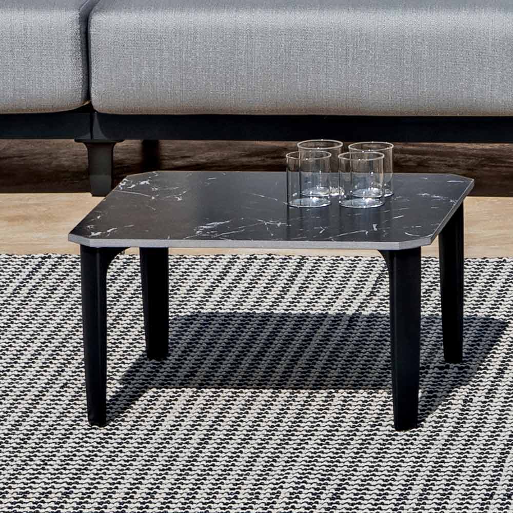 Nízký venkovní konferenční stolek z hliníku a čtvercová deska z porcelánového kameniny, vysoce kvalitní výrobek vyrobený v Itálii.