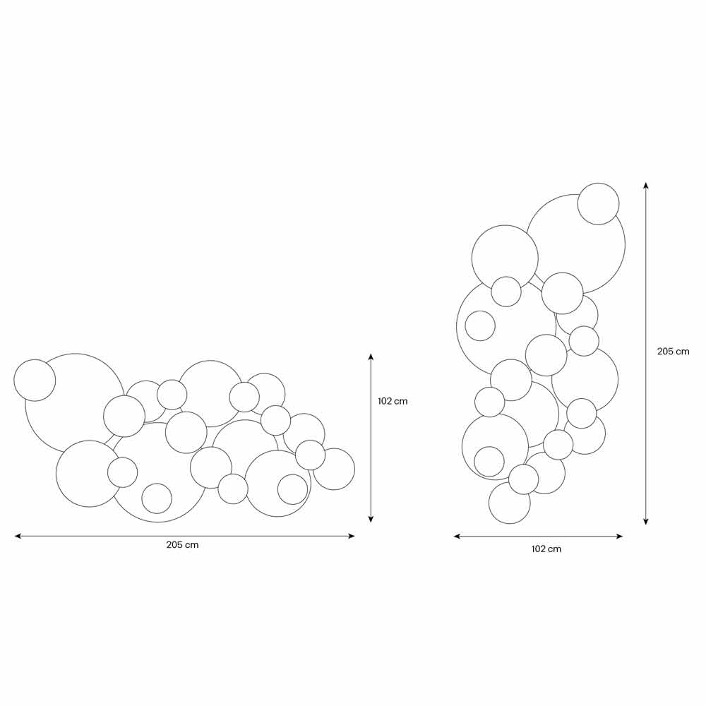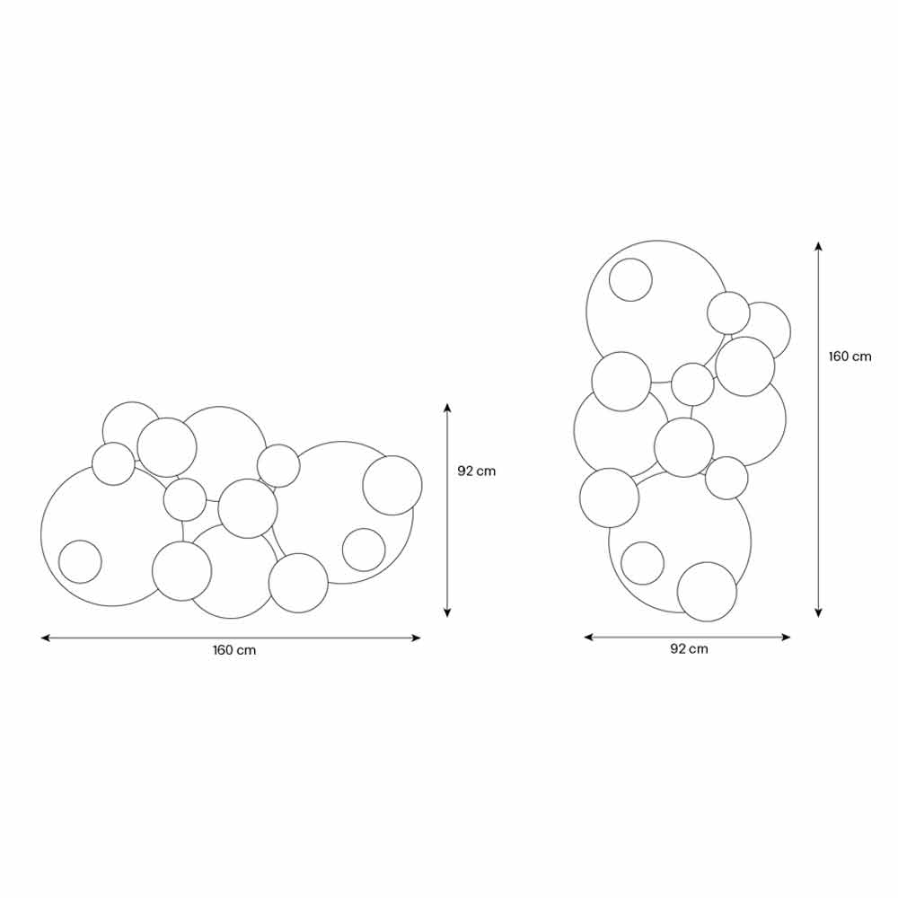 Nástěnné zrcadlo se skládá z řady kruhových zrcadlových prvků různých velikostí a v různých povrchových úpravách : zrcadlové, kouřové, bronzové, zlaté, růžové a šedé.