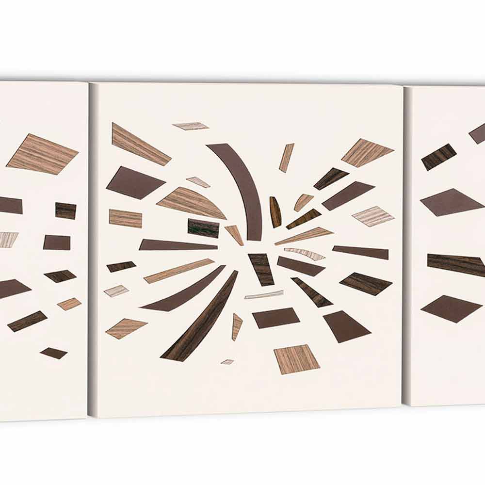 Elegantní dekorativní nástěnný panel vyrobený v Itálii s podporou ze směsného bavlněného plátna (330 g) aplikovaného na dřevěný rám a obohaceného o laminátové a tónové dřevěné aplikace charakterizované různými esencemi a barevnými odstíny. Tři panely se spojily, aby oživily výsledek s nádherně vyváženým designem, zvláštní strukturou a barvami, které z něj dělají skutečné umělecké dílo, perfektní doplněk prostředí se silnou moderní osobností . Jeho zvláštnost je reprezentována mimořádnou elegancí, kterou udělují dřevěné detaily, které vytvářejí harmonickou a exkluzivní kompozici schopnou podtrhnout současnou estetiku celého panelu.