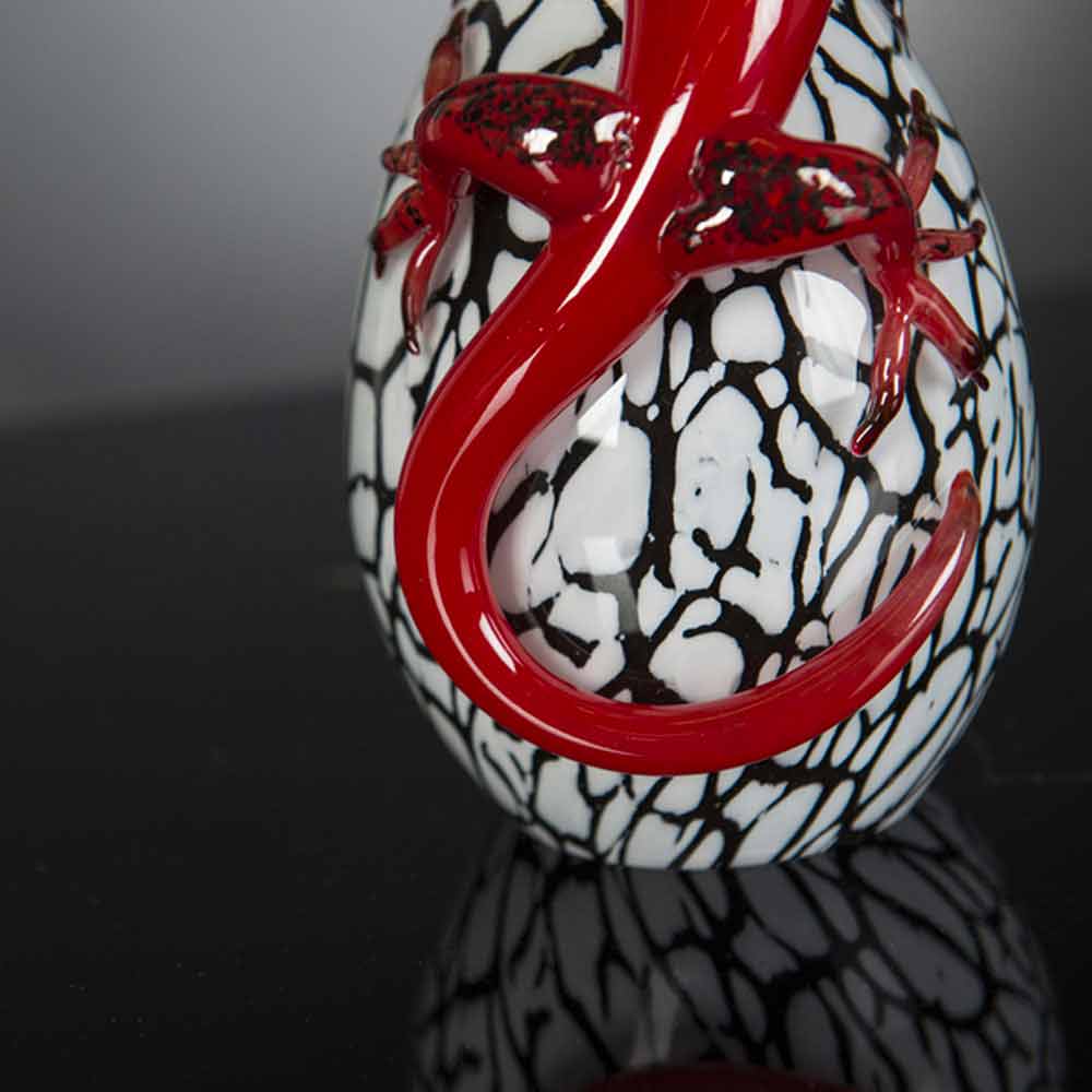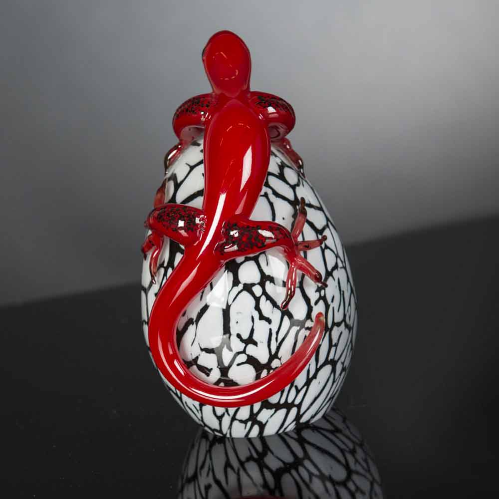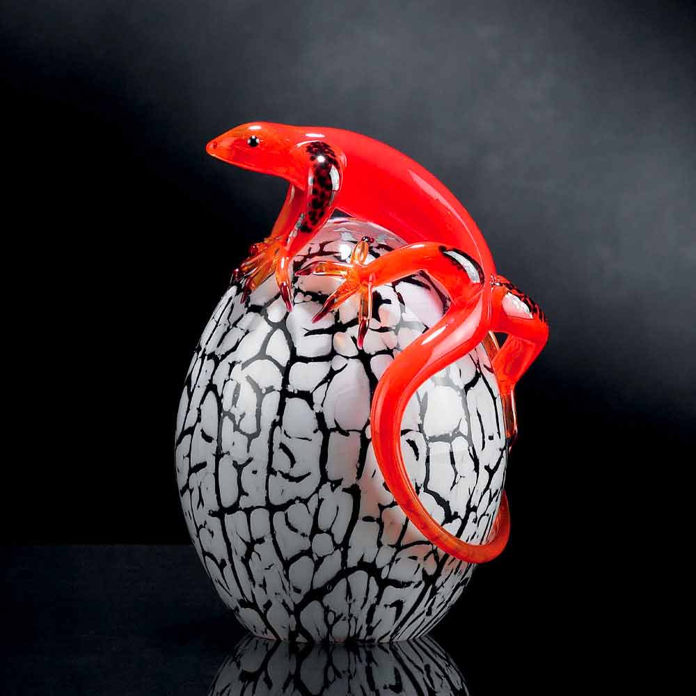Socha ve tvaru vejce s gekonem vyrobená v Itálii v bílém, černém a červeném skle . Excentrický dekorativní prvek pro vaše domácí prostory, který díky své silné kreativní osobnosti dokáže dát originální nádech . Jeho neobvyklá a barevná estetika nepochybně představuje jeho silnou stránku, díky čemuž je dokonalým nápadem pro ty, kteří rádi obohacují domácí prostředí originálním a elegantním způsobem současně díky objektu podtrženému exkluzivními liniemi a nadčasové eleganci skla a jeho nádherné barvy. Výsledkem je jednoduchý dekorativní doplněk do domácnosti, který díky moderní duši a avantgardnímu designu obohatí styl každého domova barevným nádechem .