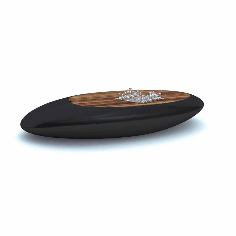 Scénografický konferenční stolek se zaoblenými a zkosenými tvary, odtud název Drop (v angličtině kapka).
