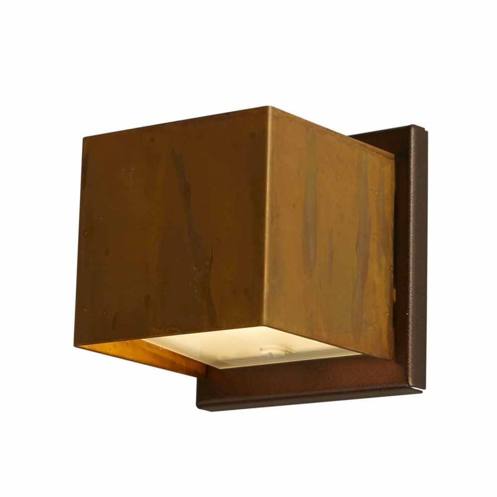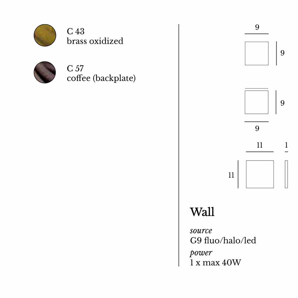 Nástěnné svítidlo s mosazným strukturou oxidovaným a podklad v práškové oceli potažené. K dispozici ve dvou velikostech v čtvercový nebo kulatý tvar. Tvrzené sklo difuzér pro vyzařování světla přímé a nepřímé.
