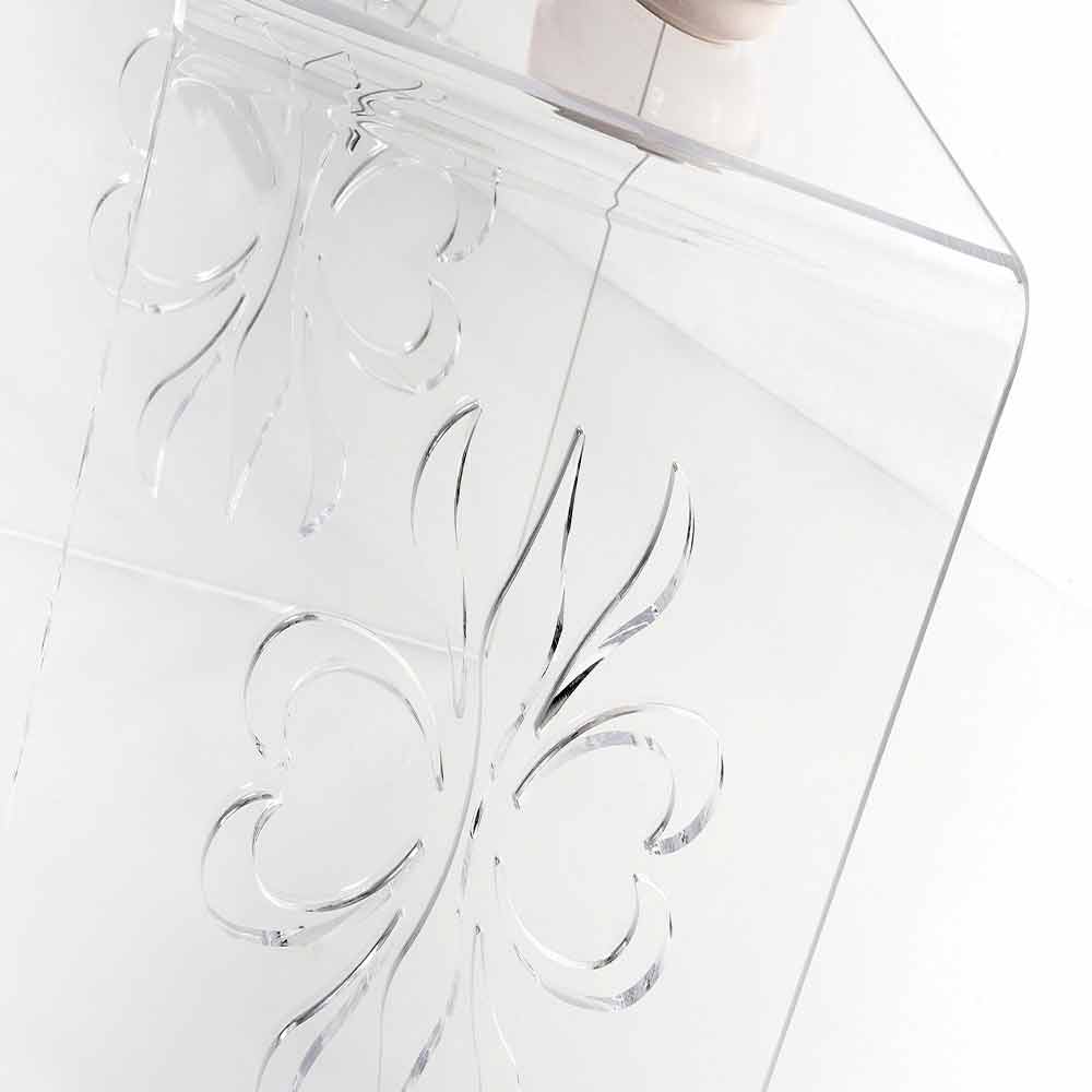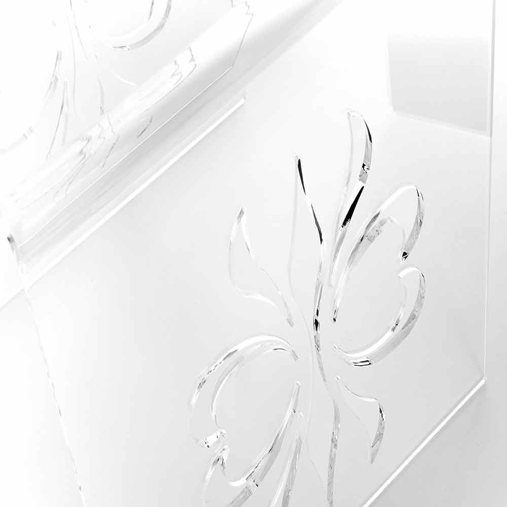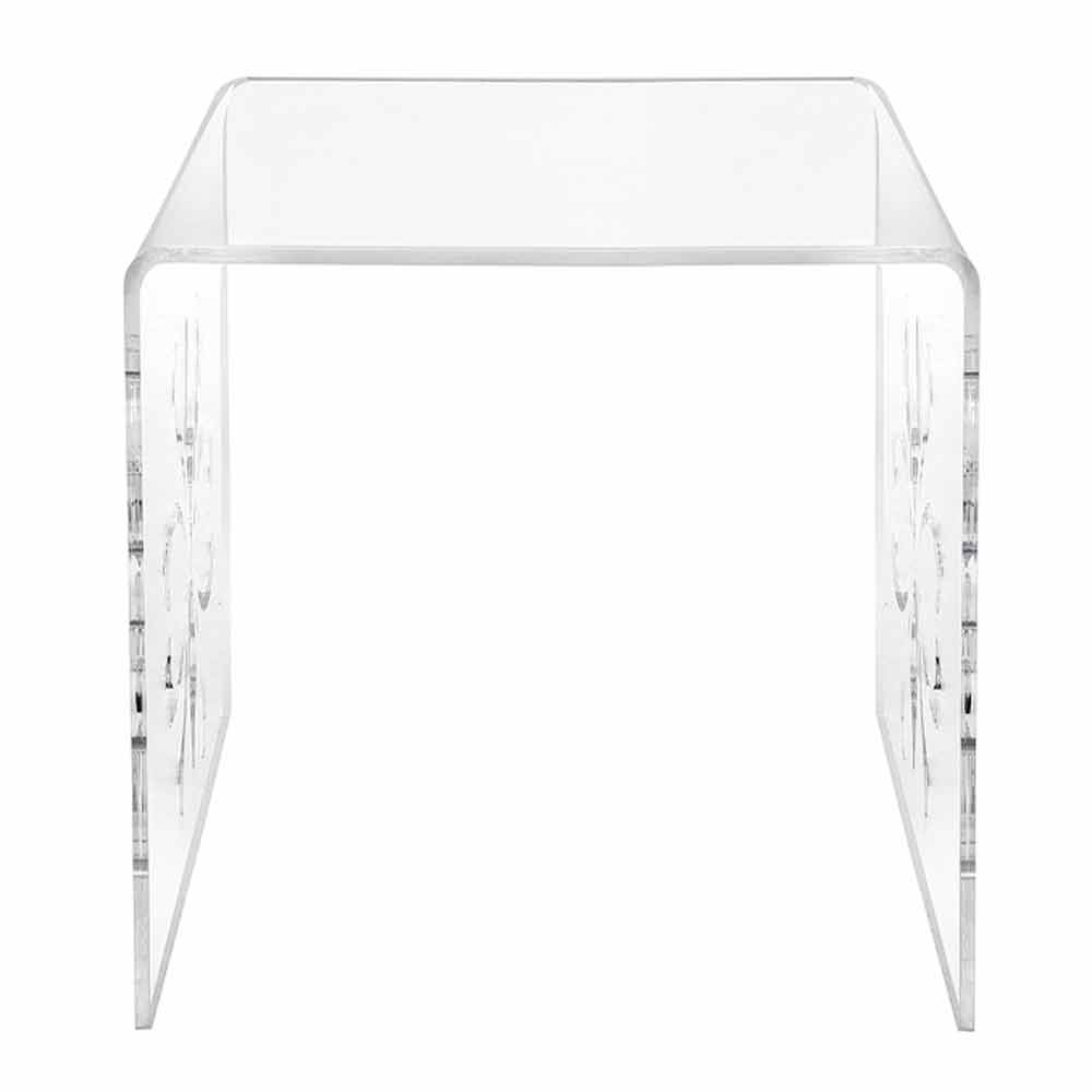 Mandas je malý stolek vyrobený z nejčistšího akrylového křišťálu, ozdobený bočními intarzovanými pracemi s přesností laserového řezu. Vysoká kvalita materiálu a tloušťka stolu zvyšují jeho brilanci. Ideální místo před pohovkou je diskrétní a rafinovaná přítomnost v jakémkoliv prostoru, jak klasickém, tak moderním.