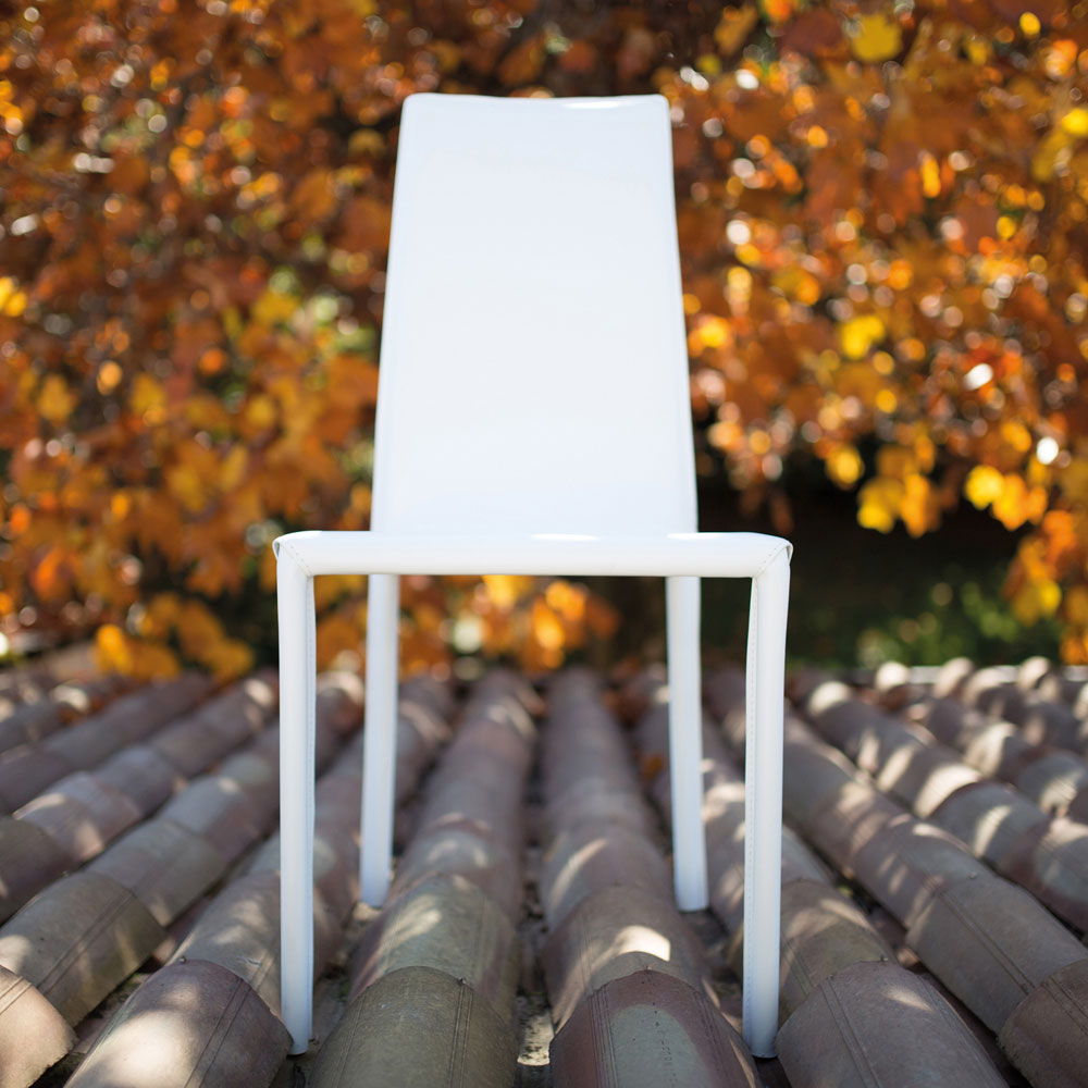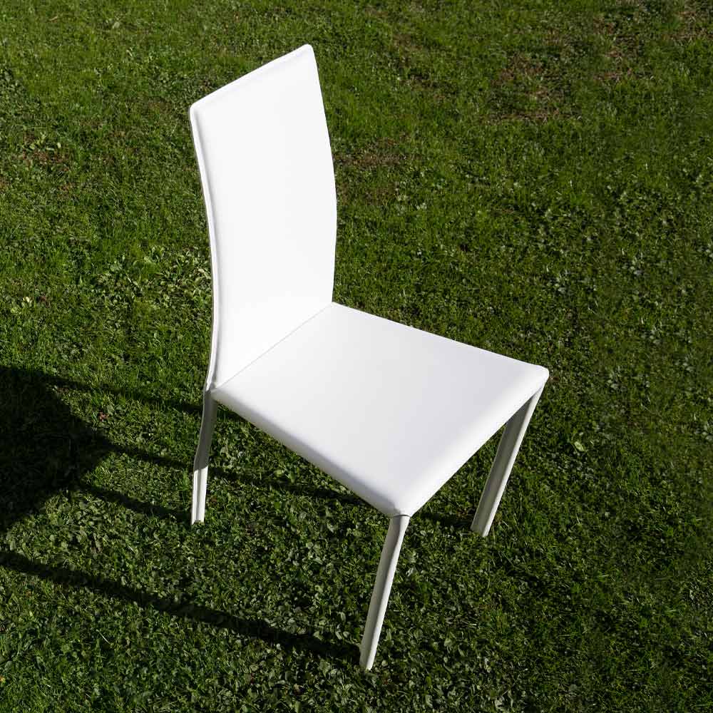 Jídelní židle celá vyrobená v Itálii, celá potažená bílou kůží a strukturou s kulatou nohou o ø 22 mm.