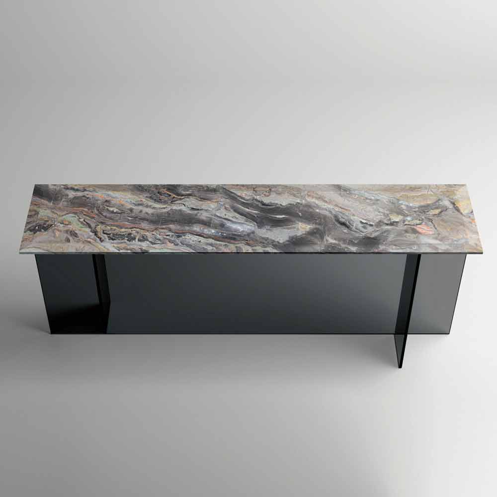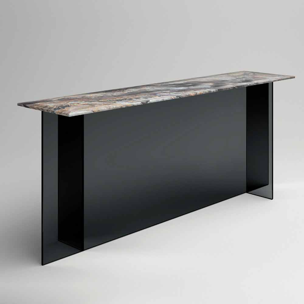 Konzole s pevným designem se zkoseným mramorovým povrchem a skleněnou základnou Made in Italy.