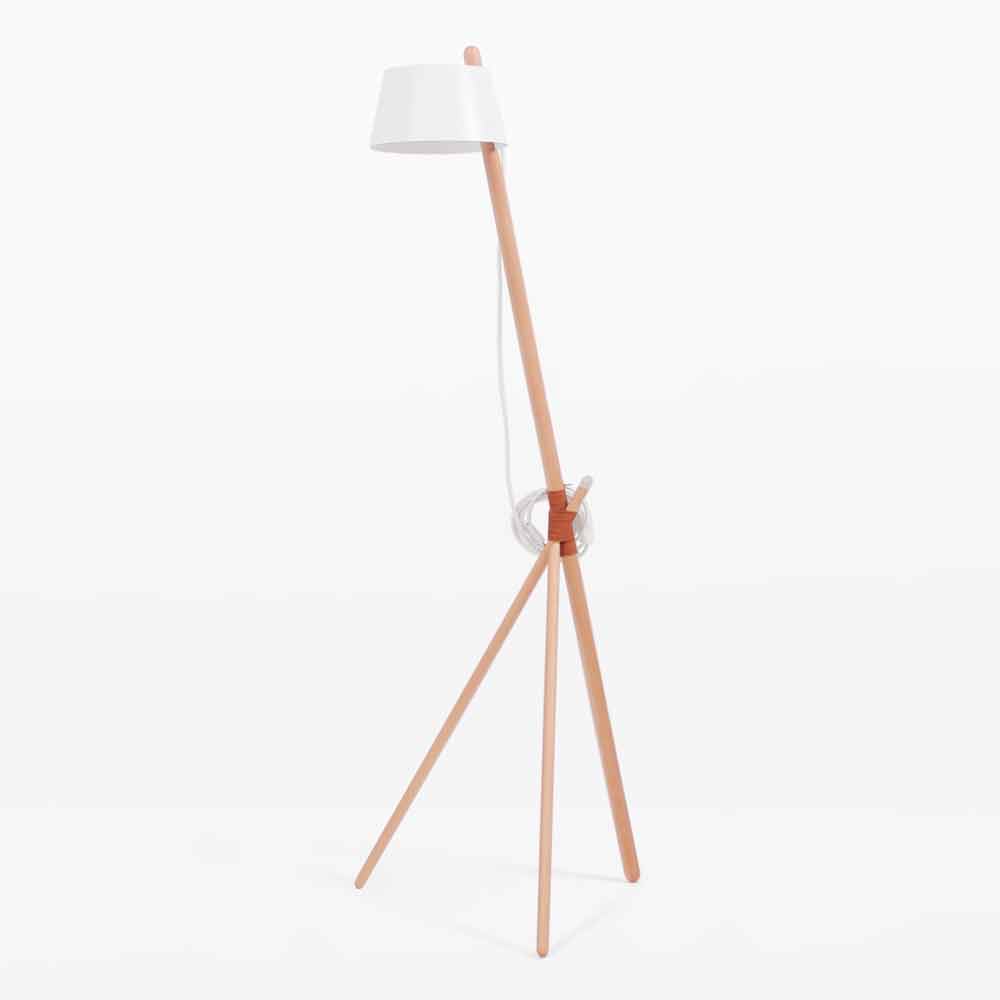 Moderní designová stojací lampa z masivního dřeva s detaily z veganské kůže.