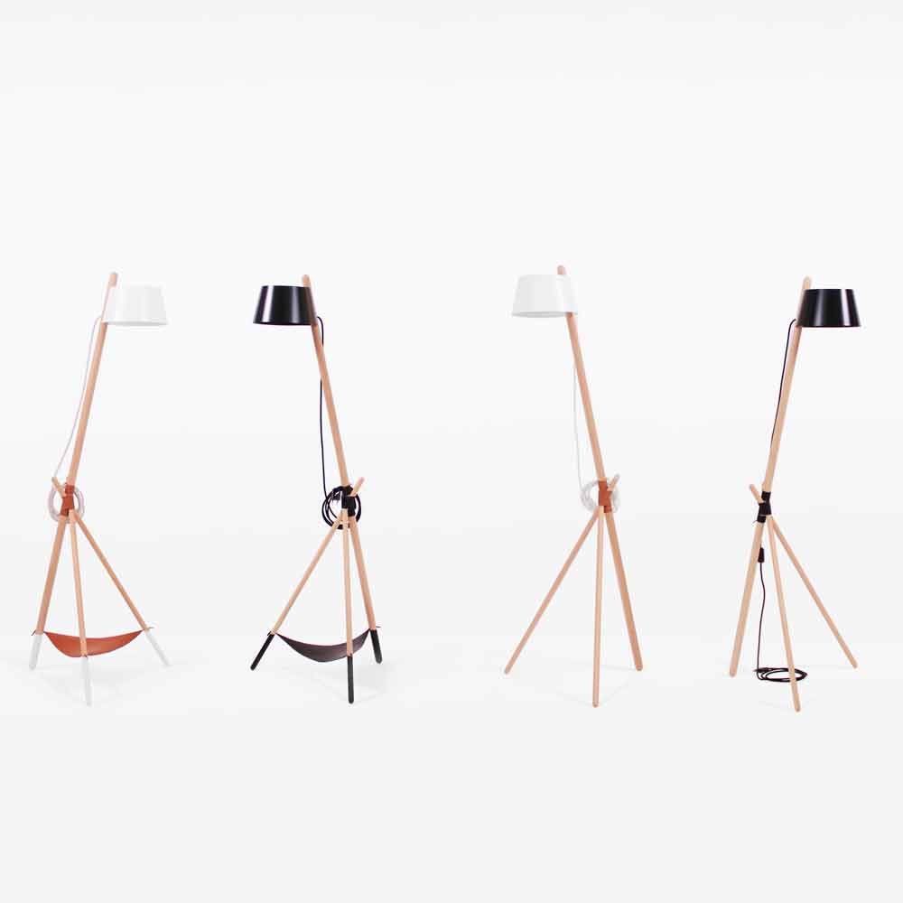 moderního stylu schopného pokrýt tradičnější roli světelného zdroje místnosti, ale také za čistě dekorativní prvek schopný upoutat pozornost. Jeho struktura se skládá ze základny o délce 3 stopy z masivního bukového dřeva, které drží pohromadě šňůrkou z veganské kůže, zatímco stínidlo je z lakovaného kovu a má difuzor ze 100% bavlny, který vytváří příjemnou a příjemnou atmosféru. Lampa je k dispozici také ve variantě s praktickou a funkční poličkou vyrobenou také z veganské kůže, ideální pro umístění předmětů, jako jsou knihy nebo časopisy, abyste je měli vždy po ruce.