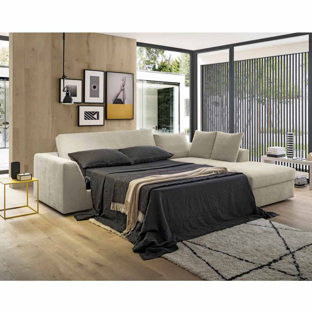 Rohová rozkládací pohovka potažená béžovou látkou vyrobené v Itálii