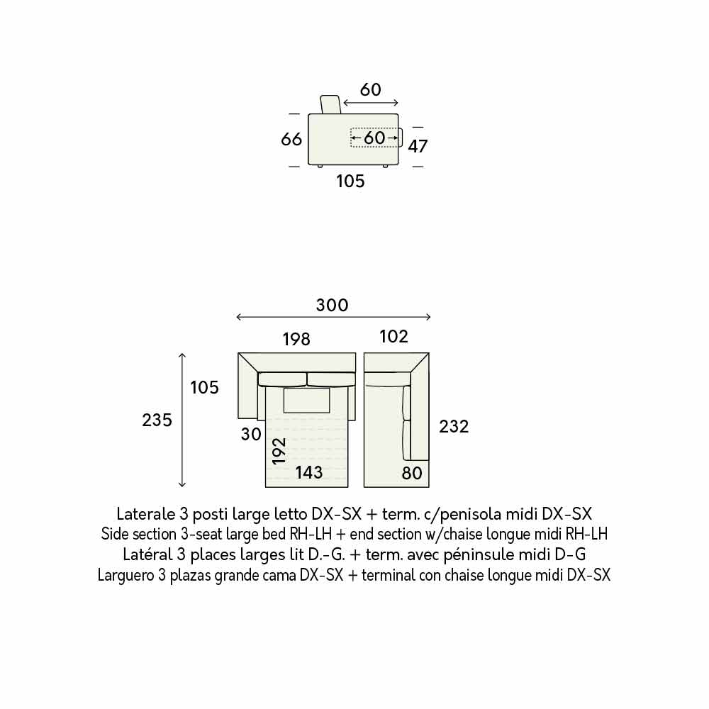 - L 300 x P 235 x H 85 cm (matrace: L 143 x P 192 x H 11 cm):
