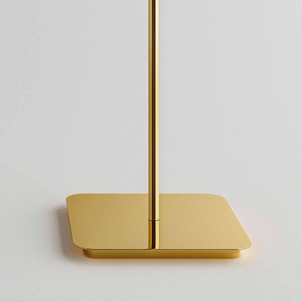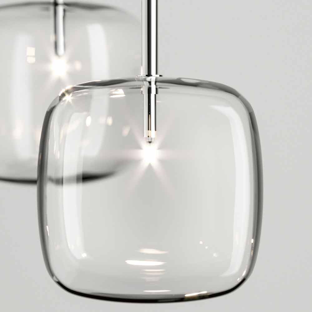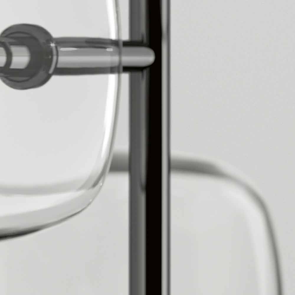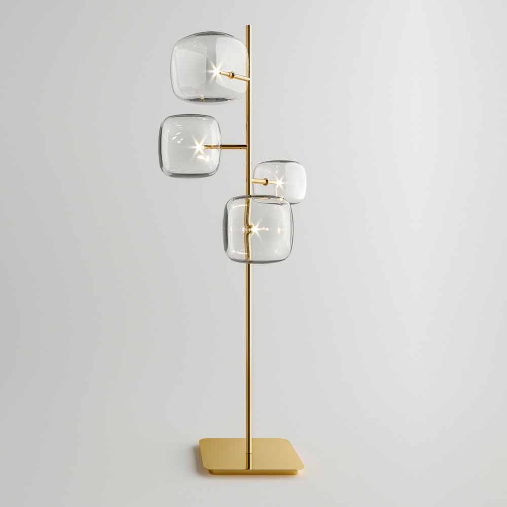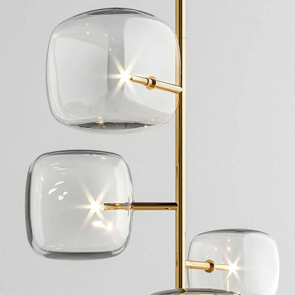 Designová stojací lampa z leštěného kovu se zaoblenými skleněnými kostkami Made in Italy.