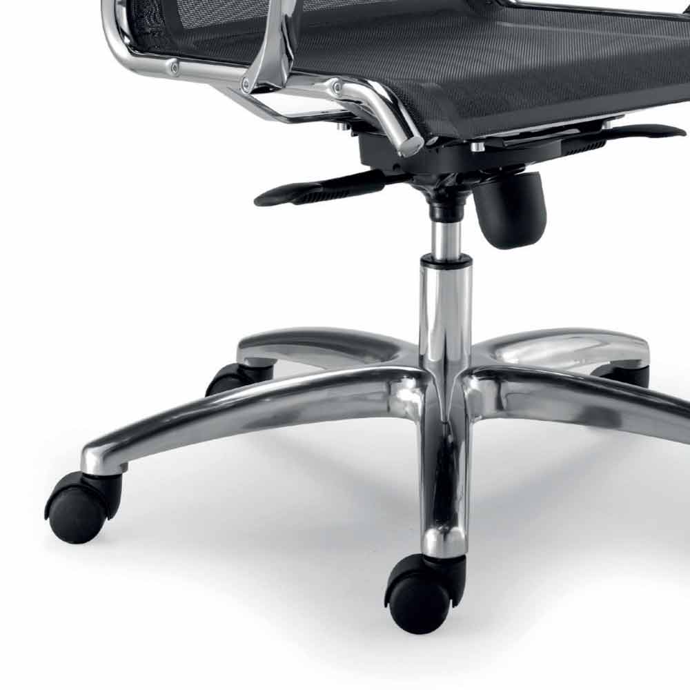 Vyznačuje se oscilačním mechanismem s pokročilým dvojitým otočným bodem v lisované oceli, kompletní se čtyřmi blokovacími polohami, bezpečnostním systémem proti opěradlu a nastavením pružného napětí pro kalibraci houpačky pomocí knoflíku. Kromě toho se jeho krása zvyšuje s pochromovanými hliníkovými područkami a pětihvězdovou základnou z leštěného hliníku, doplněnou brzdou o průměru 50 mm.