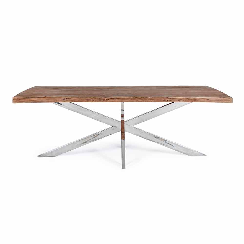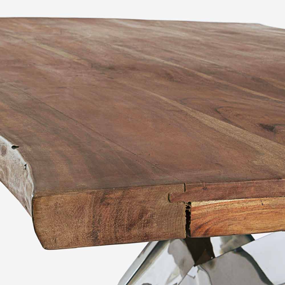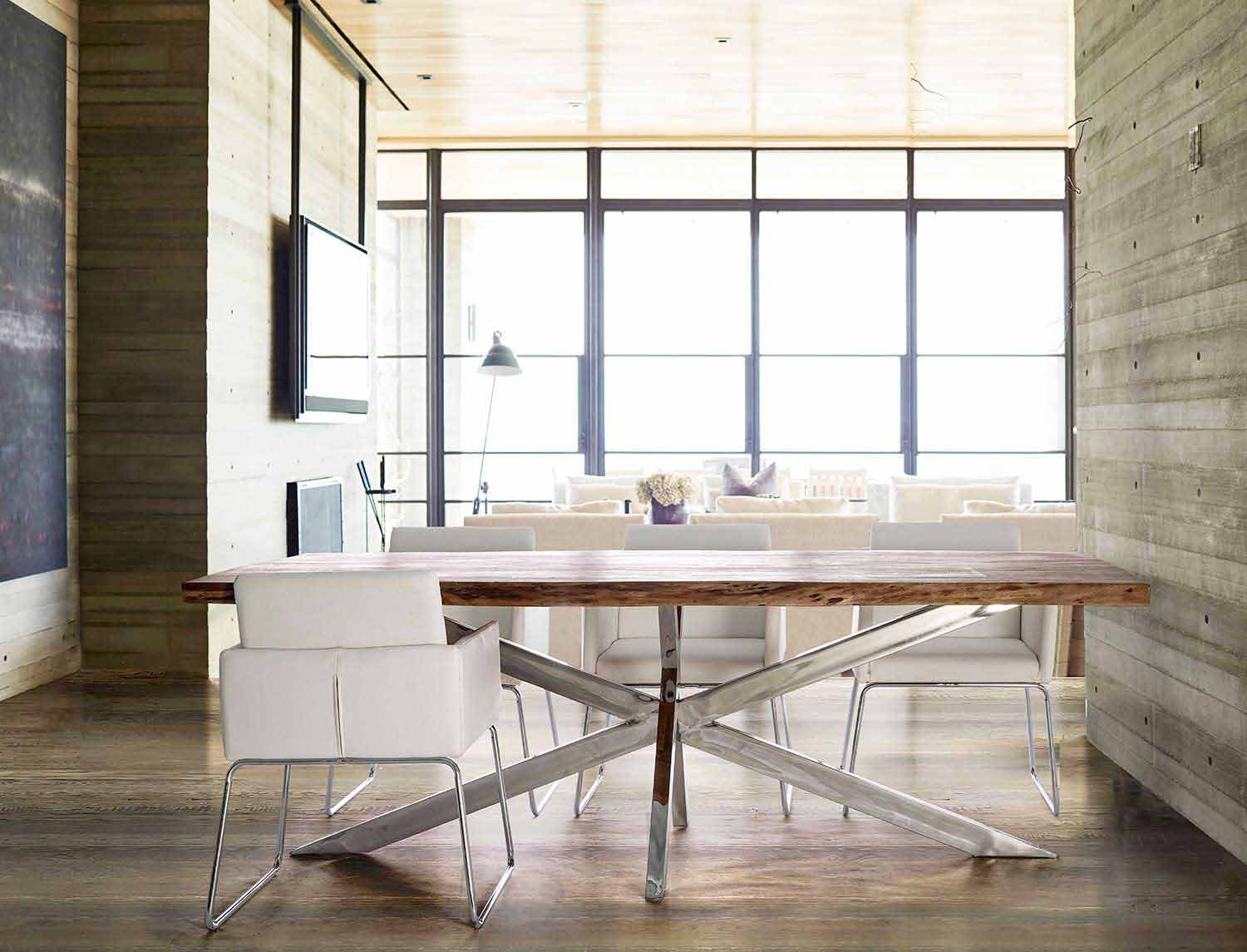 Designový jídelní stůl ze dřeva a nerezové oceli.