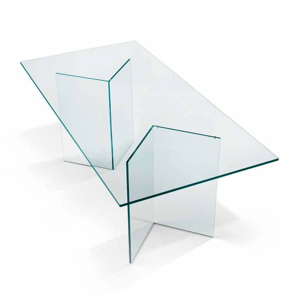 Tento obdélníkový jídelní stůl je zcela vyroben z extra čirého skla se strukturou složenou ze dvou skleněných podpěr, které mohou být uspořádány paralelně nebo zrcadlově v závislosti na použití.