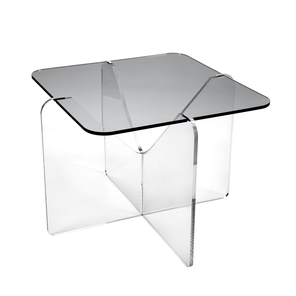 Konferenční stolek z průhledného plexiskla nebo s kouřovou deskou, hranatý design vyrobený v Itálii.