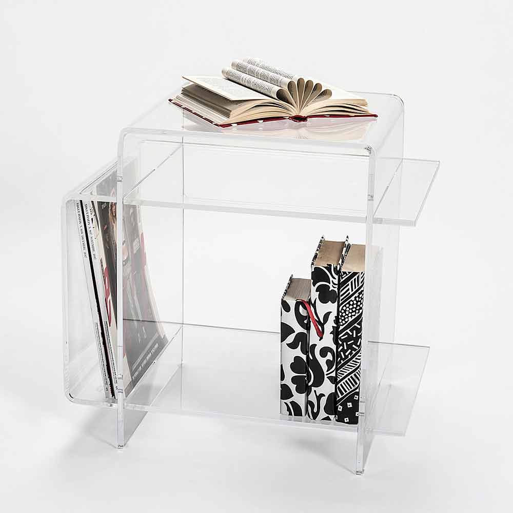 Všestranný 3-poličkový stolek / noční stolek, inspirovaný geometrií 70. let, vyroben ze 100% panenského transparentního plexiskla, řezaného laserem a složený při vysokých teplotách.