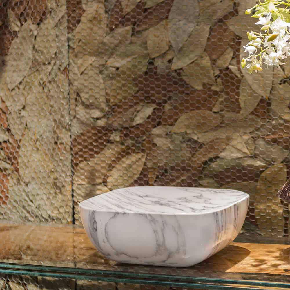 Vyrobeno v Itálii dekorativní podnos v bílém mramoru Carrrara , vzácná paleta mramoru, který se vyrábí zpracováním přírodních kamenů, umožňuje získat složitější tvary. Objekt vnitřní elegance, který vzniká při setkání mezi studiem přírodních jevů a interakcí různých materiálů s technologiemi používanými člověkem. Výsledkem je sofistikovaný a všestranný kus nábytku, který umožňuje použití jako skutečný podnos, jako rafinovaný středový díl, ale také jako prázdná kapsa, pokud je umístěna u vchodu, nebo jako jednoduchý dekorativní prvek na jakémkoli místě v domě, což dokazuje díky nadčasové eleganci mramoru a jeho nádherným žilám dokáže dát nábytku zvláštní nádech.