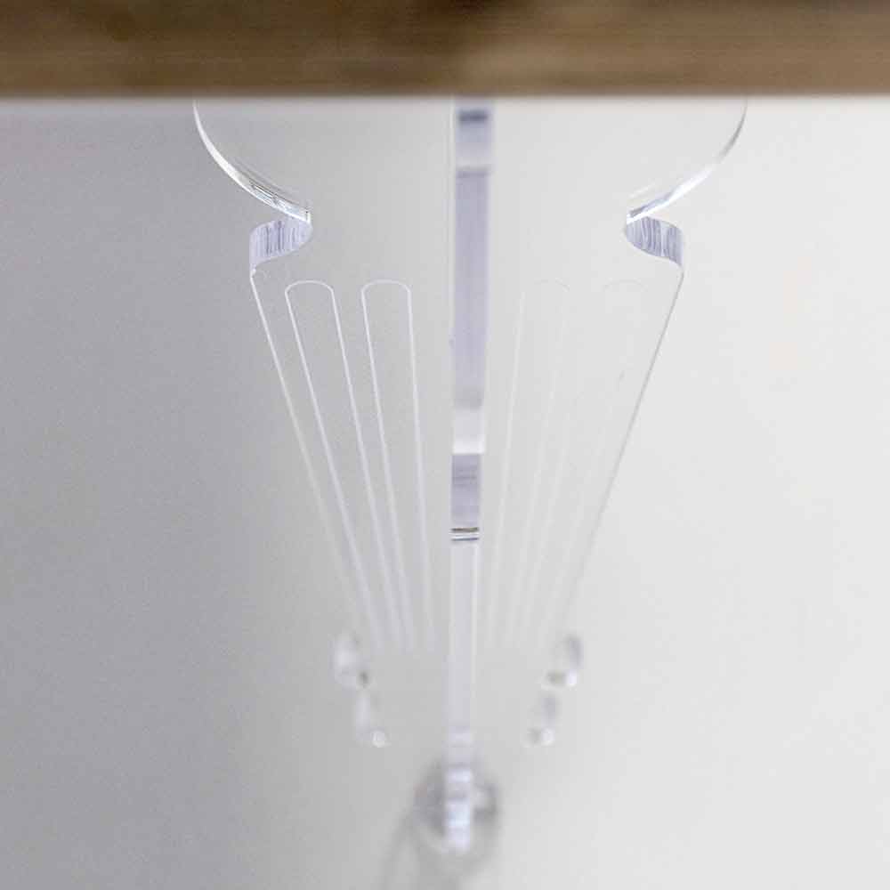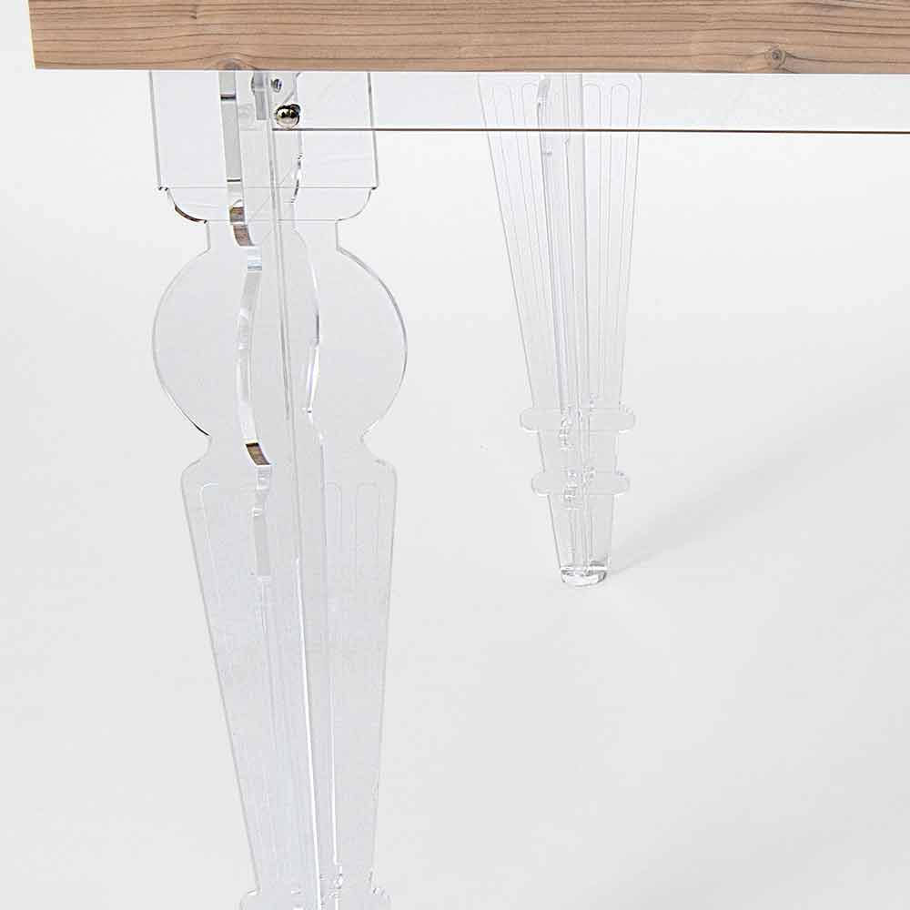 Castro je dokonalým výsledkem kombinace dvou vynikajících materiálů: nohy v čistém akrylovém křišťálu PMMA a top v tmavém smrkovém dřevu s matným přírodním broušeným povrchem.