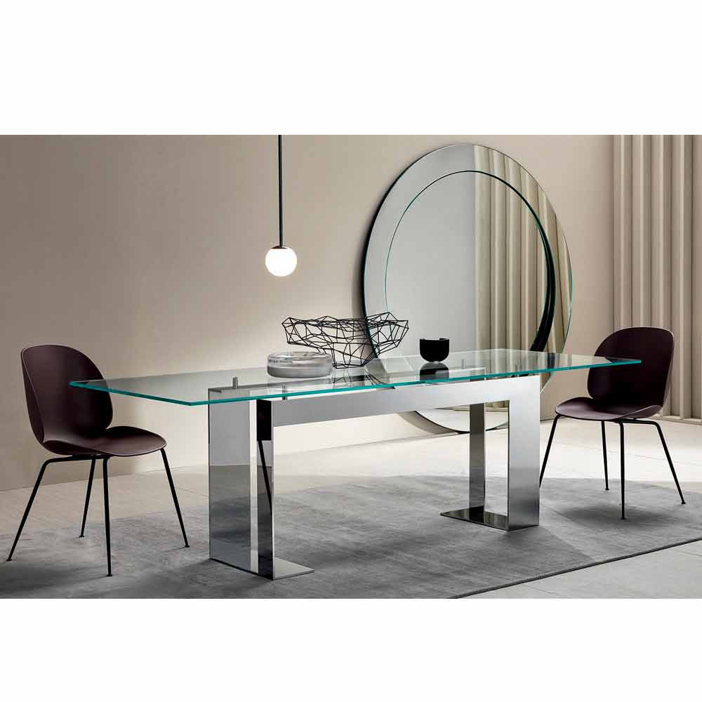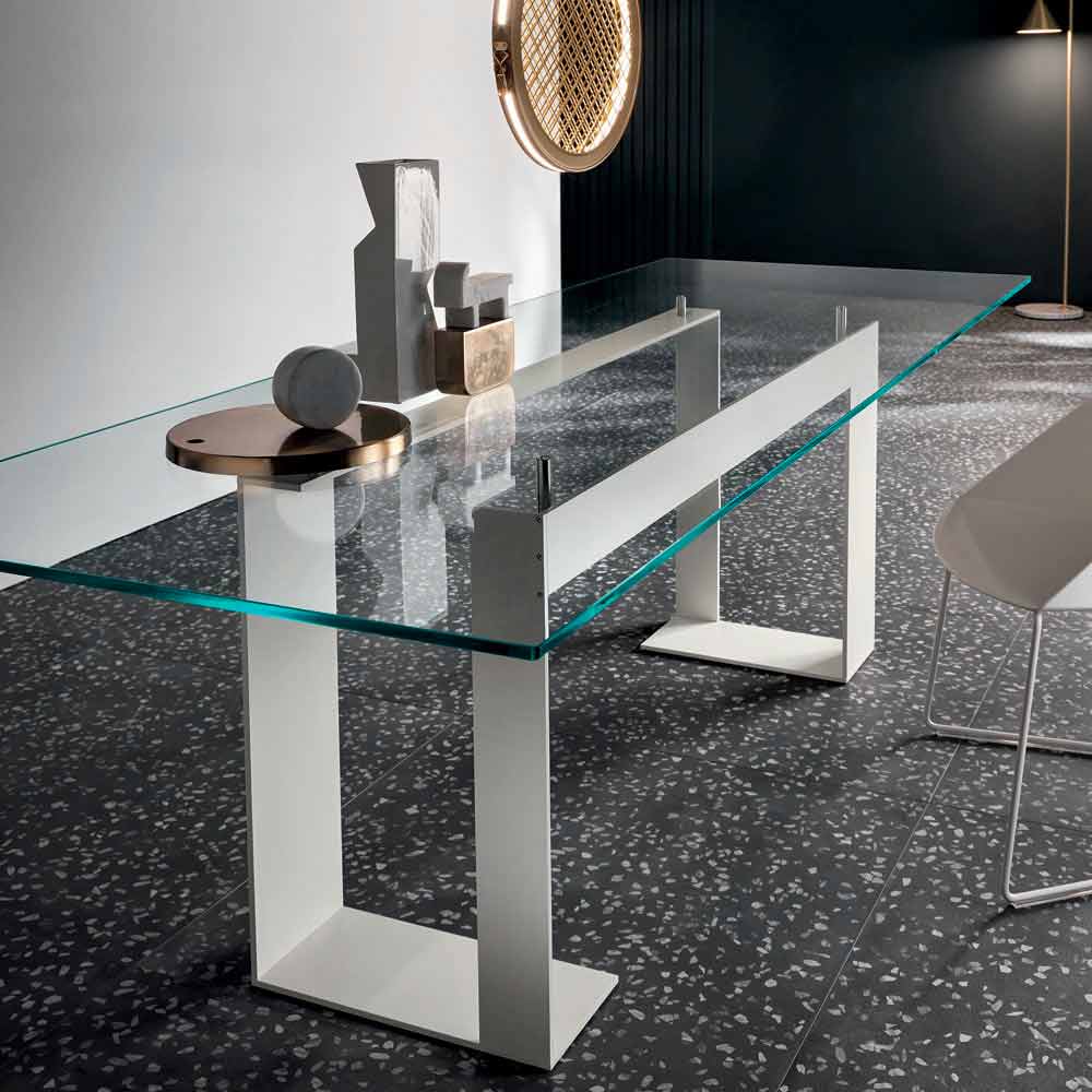 Tento jídelní stůl má extra čiré tvrzené sklo, které spočívá na 4 podpěrách, které jej zvedají z kovové konstrukce dostupné ve 3 povrchových úpravách a 4 různých velikostech.