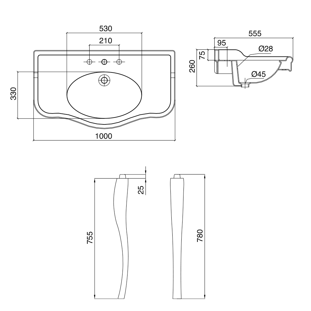 - top: š 100 x hl 55,5 x v 26 cm s jednoduchým umyvadlem; nohy: v 78 cm s odspodu a odspodu 1-3 otvory pro baterii - d 1000 mm;