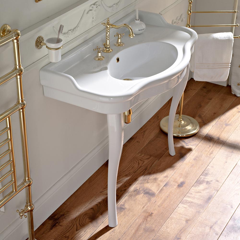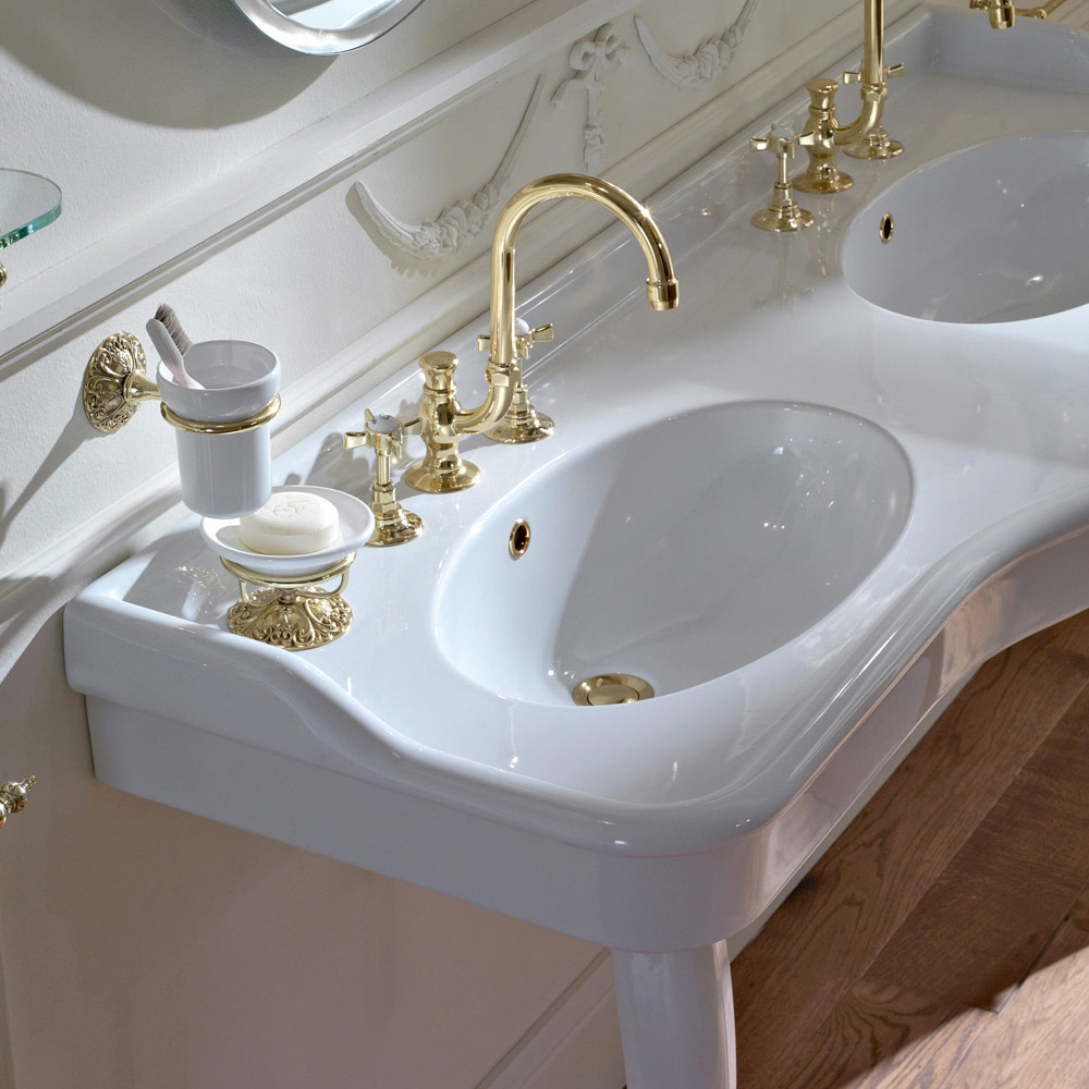 Vintage koupelnový konzolový stolek s bílým keramickým dvojitým umyvadlem Paulina, vyrobeno v Itálii.