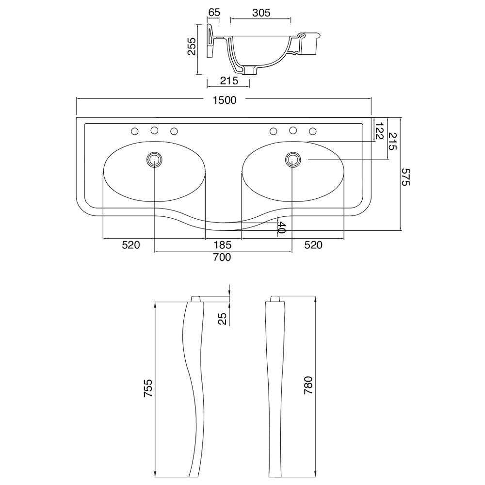 - vrchní deska: D 150 x Š 57,5 x V 25,5 cm s dvojitým umyvadlem; nožičky: V 78 cm se splashbackem 1-3 otvory na baterii pro umyvadlo - D 1500 mm;