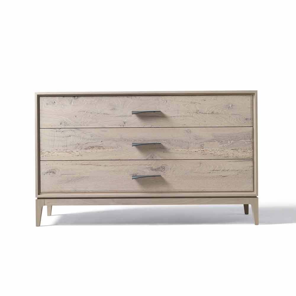 V detailu, přirozený vzhled 3-zásuvek prádelník. Přesné olej povrch, který zvyšuje léta dřeva, je výsledkem řemeslného zpracování provádí ručně. Speciální tvar rukojeti dodává nádech charakter a osobnost na vybavení.