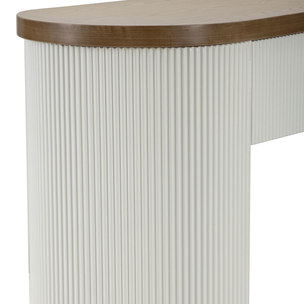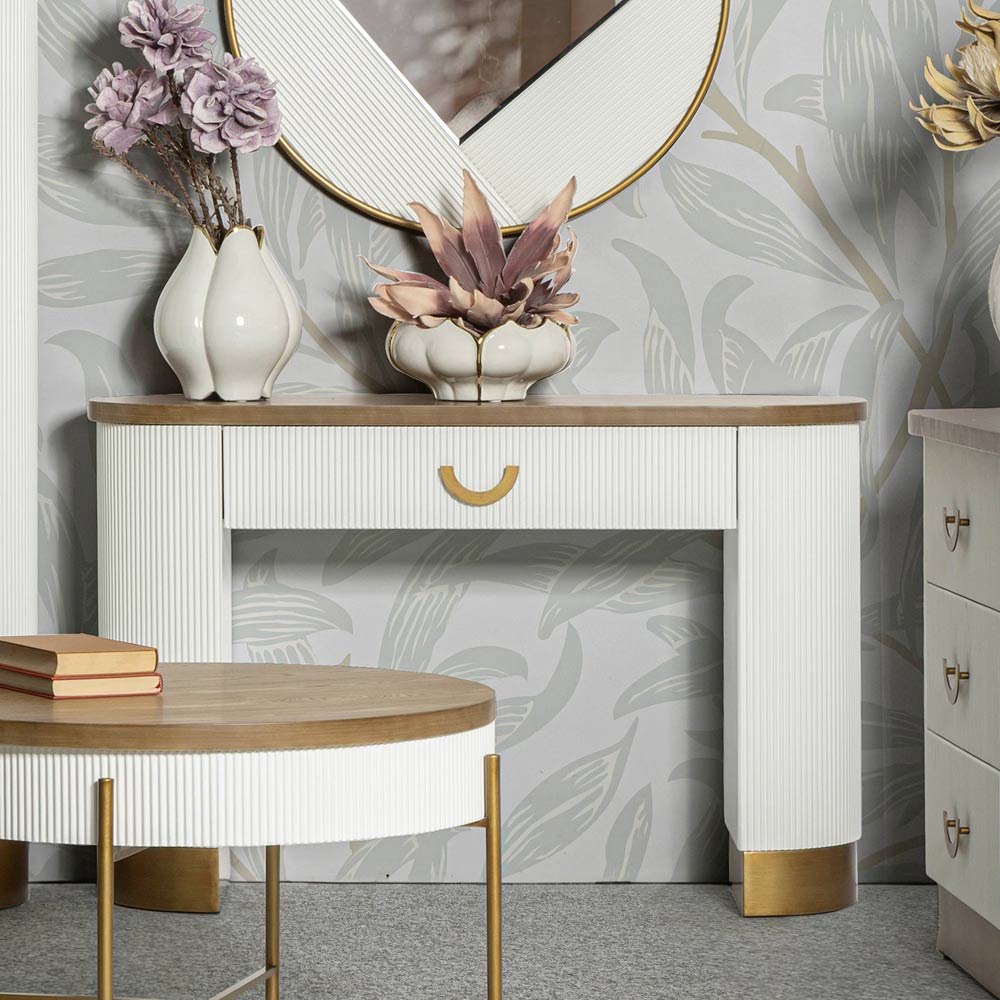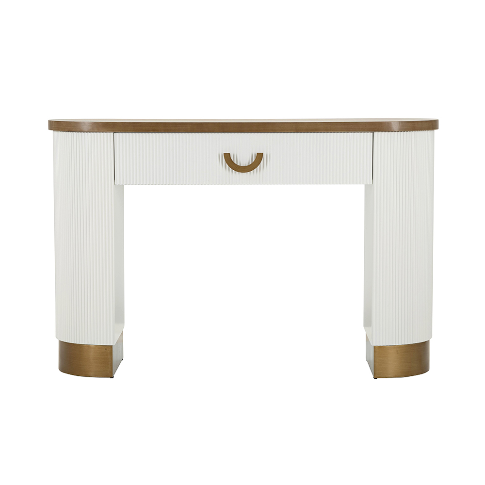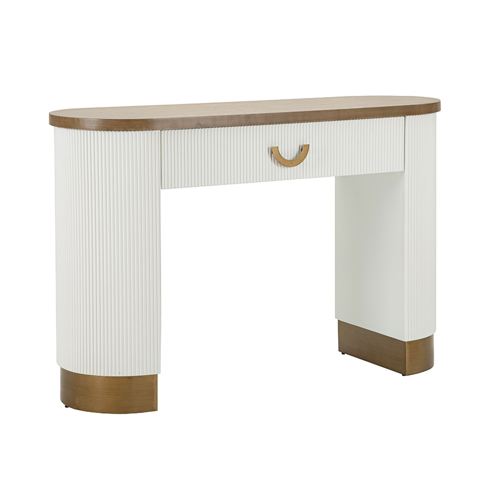 Tato půlkruhová konzole představuje okouzlující spojení současného designu a klasických detailů. Elegantní struktura s čistými liniemi a teplými povrchy MDF harmonicky kontrastuje s jemností vertikálních drážek , které zdobí boční panely, a nabízí bohatý vizuální zážitek a podmanivou texturu.