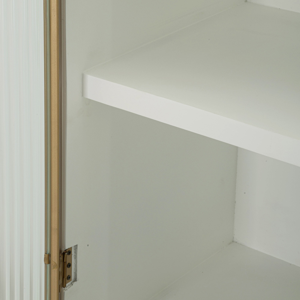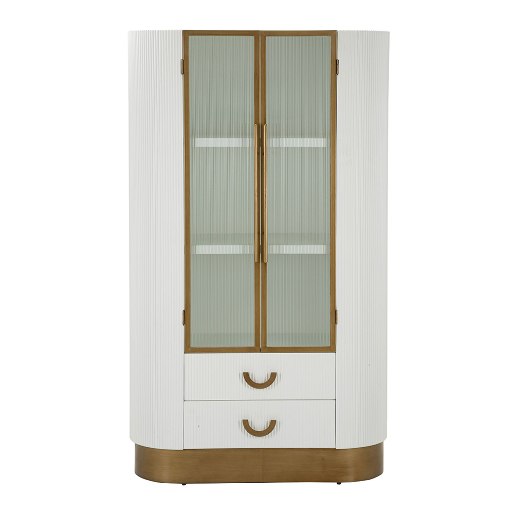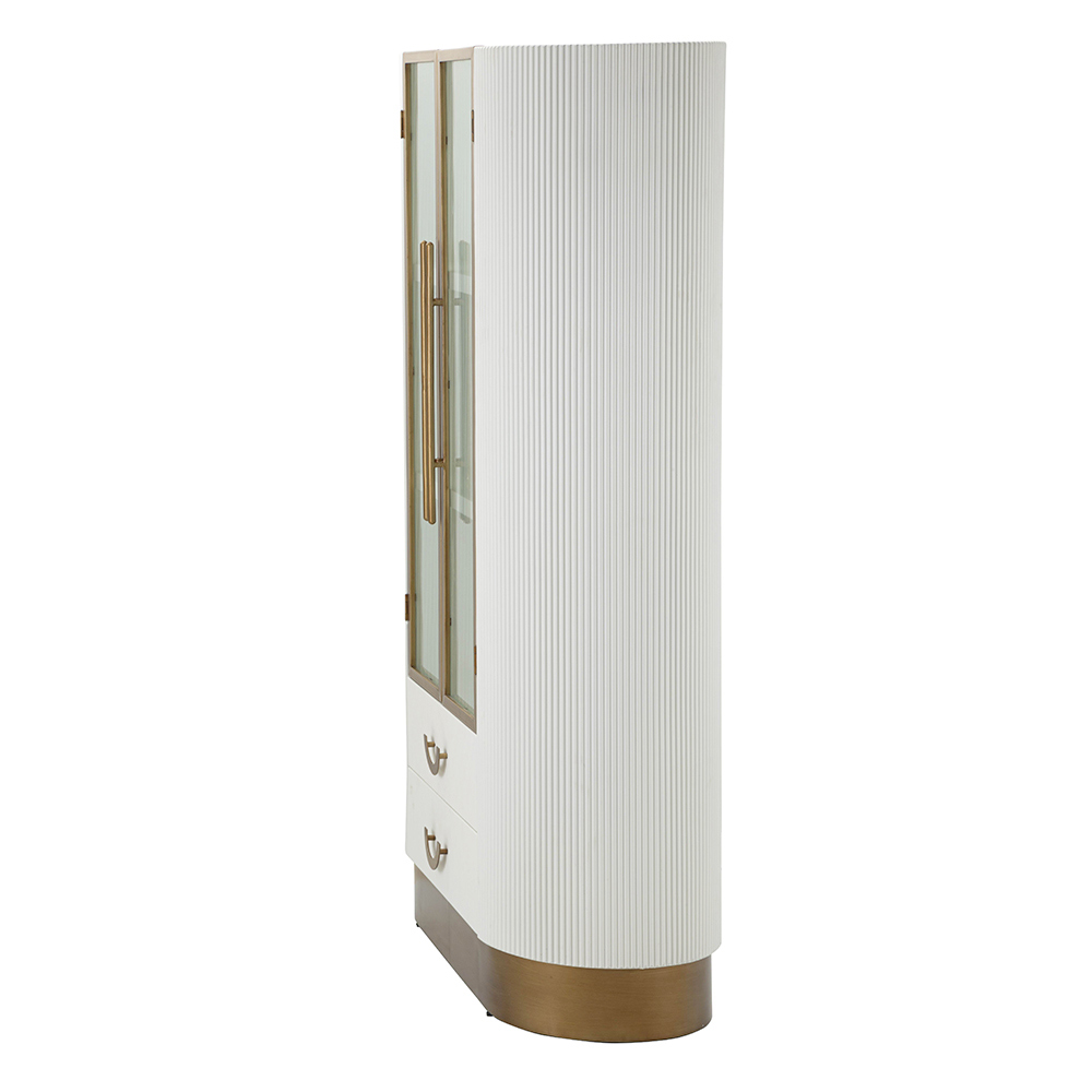 Bílá povrchová úprava s vertikálními rýhovanými detaily dodává dotek vizuální textury a hloubky , zatímco linie základny a úchytů vytvářejí teplý kontrast, který nábytek dále povyšuje. Jeho zaoblené tvary dodávají prostředí jedinečnou měkkost a zároveň nabízejí velkorysé množství úložného prostoru, uspořádaného praktickým způsobem s vnitřními policemi a prostornými zásuvkami.
