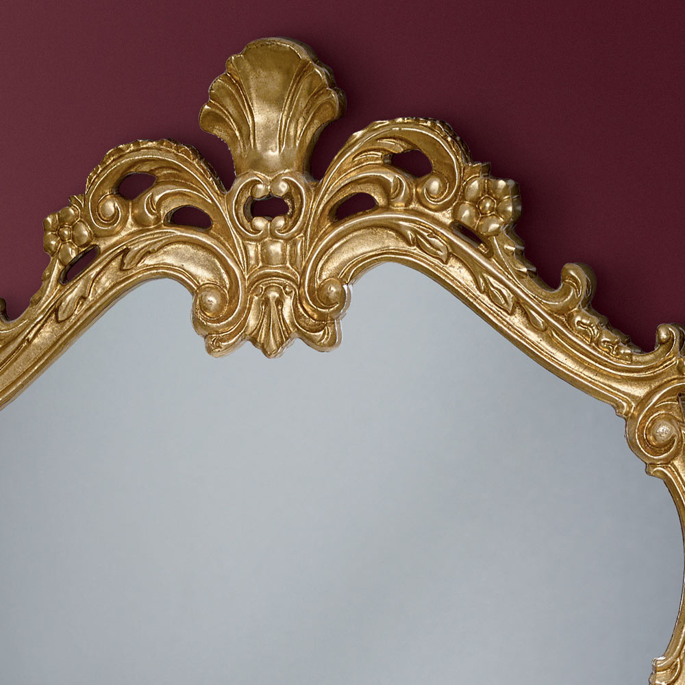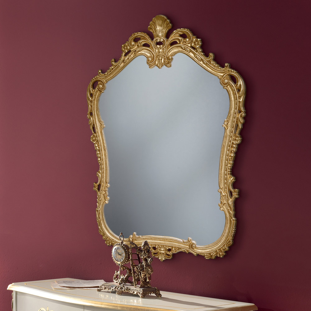Tvarované zrcadlo s perforovaným dřevěným rámem a zdobené plátkovým zlatem Toto zrcadlo v klasickém stylu je ideální pro dodání elegantního a luxusního nádechu každé místnosti.