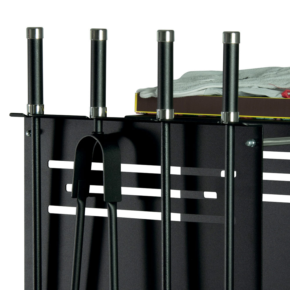 Tento multifunkční držák na polena je nezbytným doplňkem pro milovníky krbů. Vyrobeno s pevnou kovovou konstrukcí, je vybaveno kolečky pro usnadnění pohybu. Jednotka slouží nejen k uchování velkého množství palivového dřeva, ale také nabízí vyhrazený prostor pro nástroje potřebné k řízení požáru: lopatu, kartáč, svorku a hák, čímž udržuje pořádek a praktičnost.