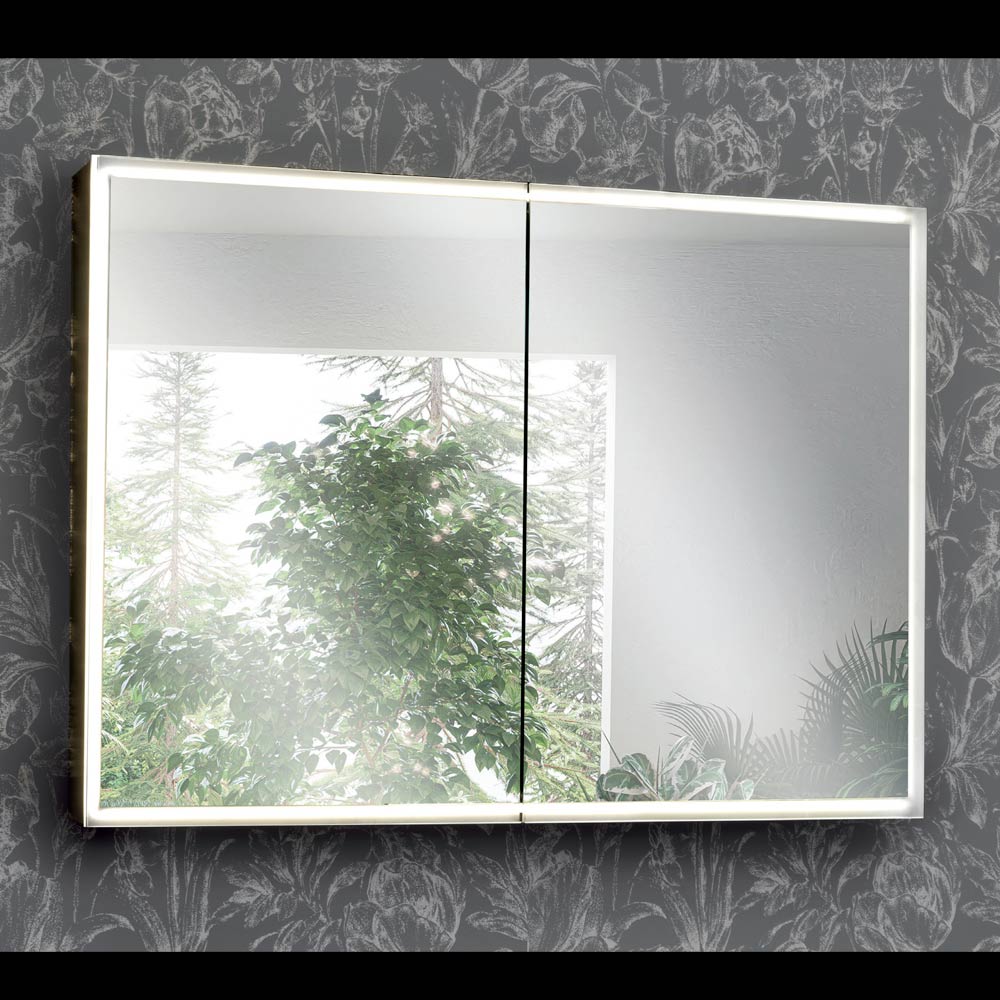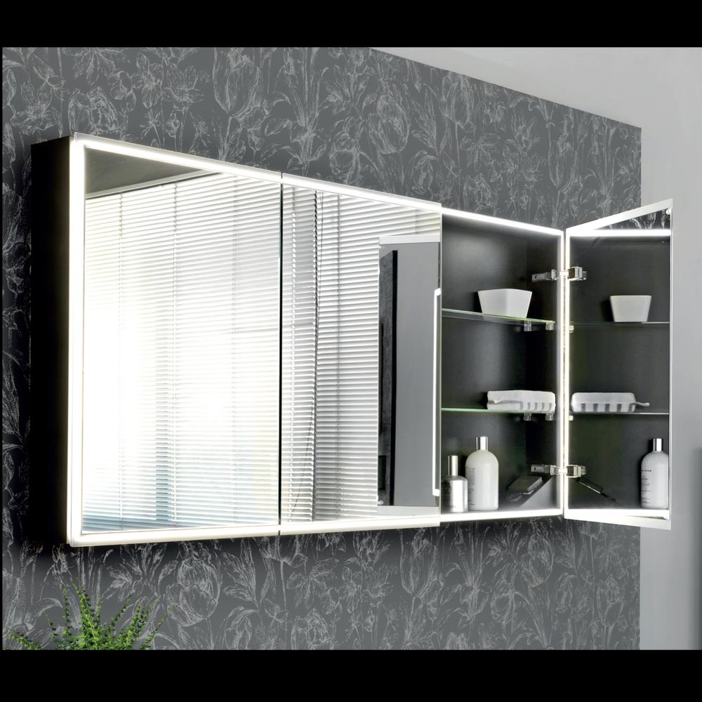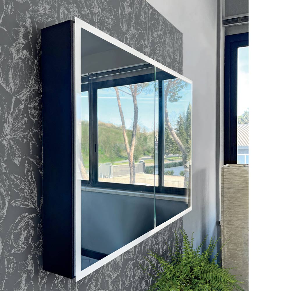 Dveře s dvojitým zrcadlem se otevírají a odhalují prostorný vnitřní prostor, ideální pro uspořádání všech vašich produktů osobní péče. LED světlo nejen zvýrazňuje design, ale také poskytuje funkční světlo, takže je ideální pro make-up, péči o pleť nebo jako doplňkové osvětlení v koupelně.