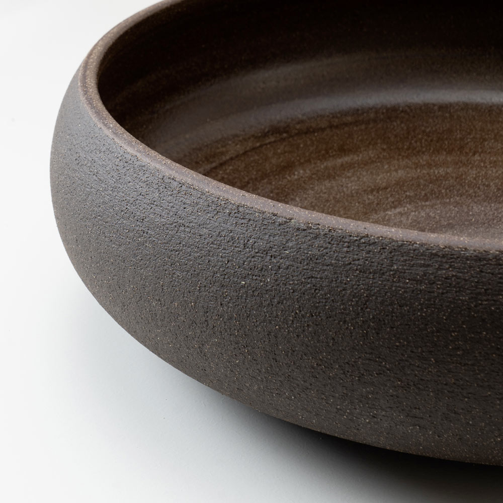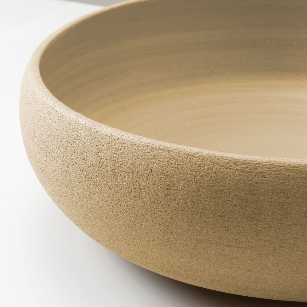 Vnitřek je opatřen lesklým průhledným krystalickým povrchem , který zajišťuje hladký a zářivý povrch, zatímco vnější strana si zachovává texturovaný vzhled šamotu, který je k dispozici ve dvou barevných variantách. Kontrast mezi smaltovaným a přírodním povrchem umocňuje řemeslný charakter dřezu.