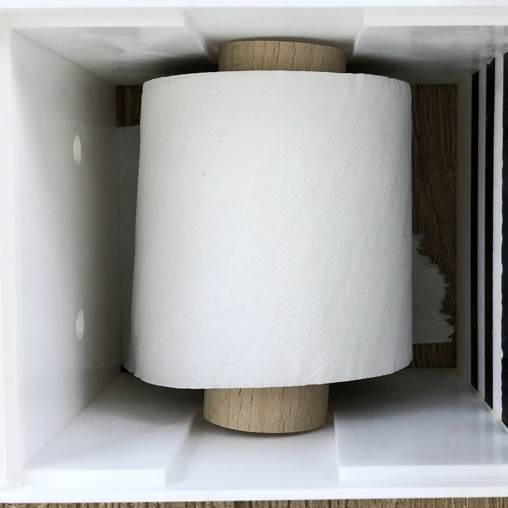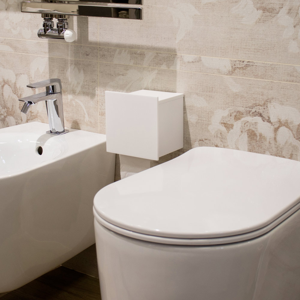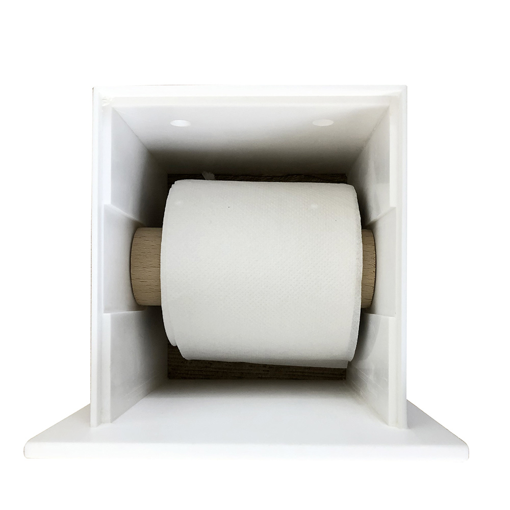 Nástěnný držák toaletního papíru v bílém corianu nebo s černými vložkami, vyrobený v italském designu.
