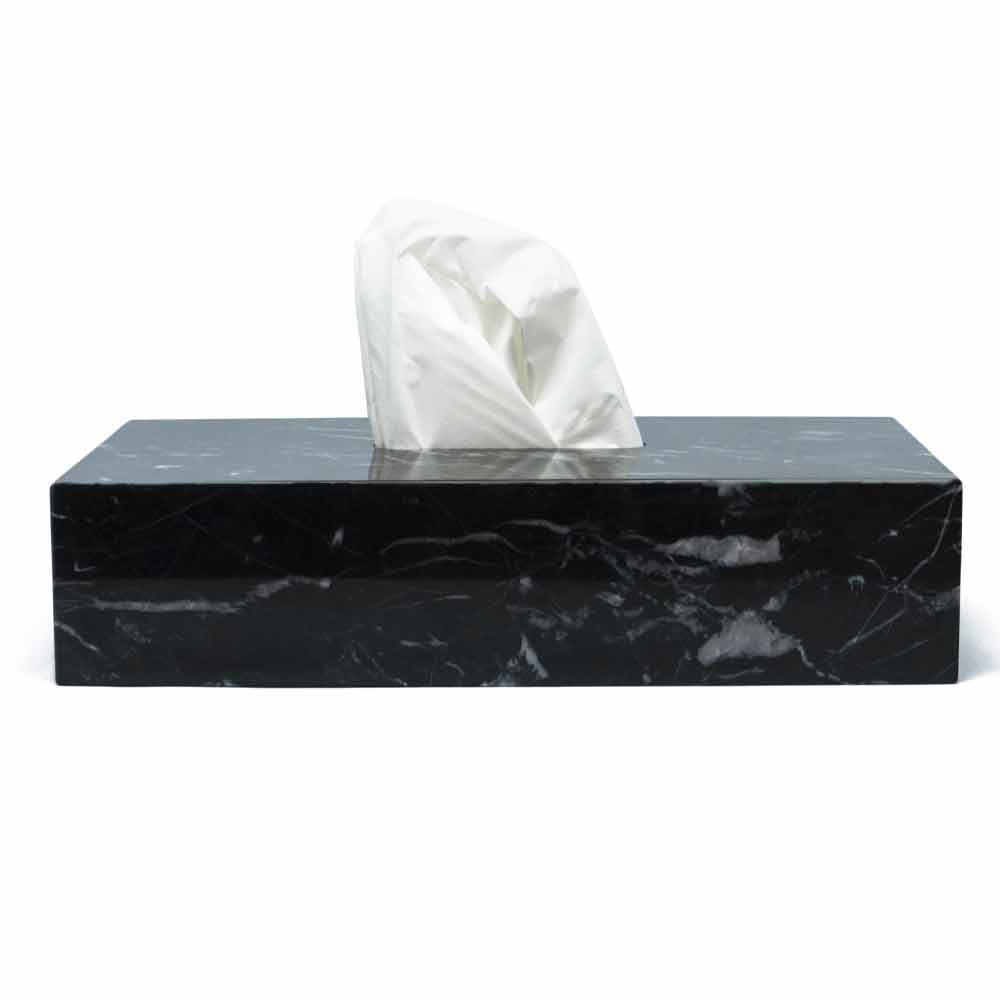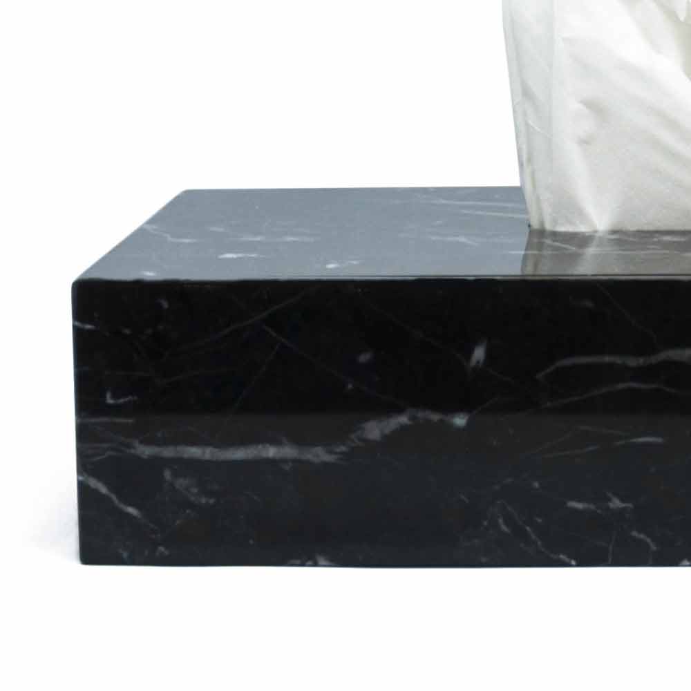 Praktická nádoba na držák na tkáň, která je k dispozici v obdélníkové verzi, je zcela vyrobena z černého mramoru Marquinia ručně vyráběná specializovanými odborníky. Jedná se o jedinečný kus, protože každý použitý blok mramoru se liší od ostatních, pokud jde o žíly a odstíny.