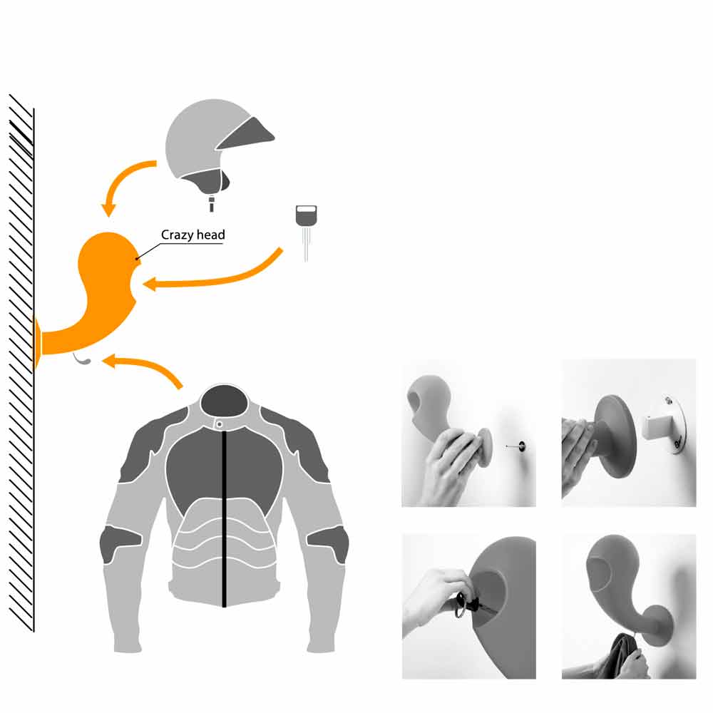 Absolutní novinka, držák přilby Crazy Head je předurčen k tomu, aby se stal nepostradatelnou nutností v domácnostech nadšenců motorek, skútrů a kol. Společnost Myyour, navržená jako originální a zábavný kus nábytku, transformuje svou funkcionalitu na multifunkčnost díky praktické kapse prázdnější přihrádce a praktickému ramínku na kabát. Může být také použit jako inovativní a stylový držák klobouku.
