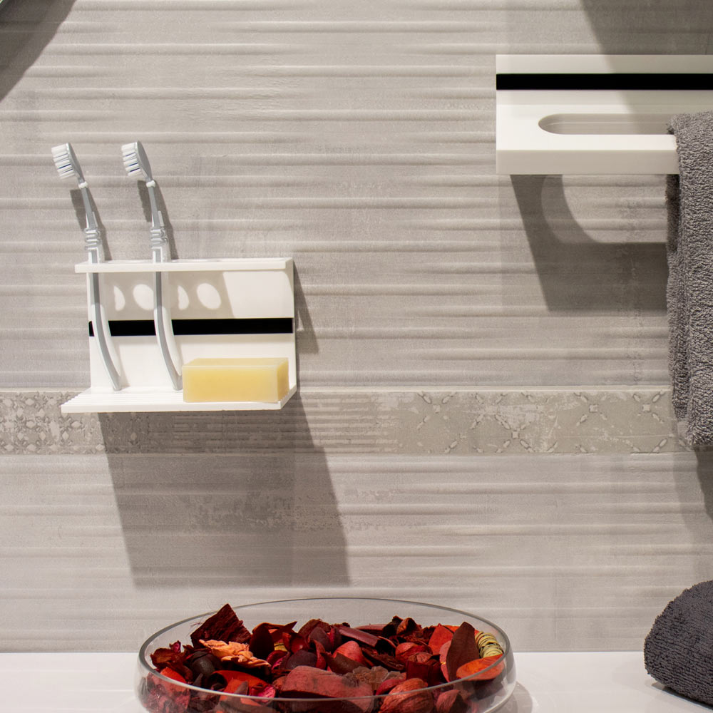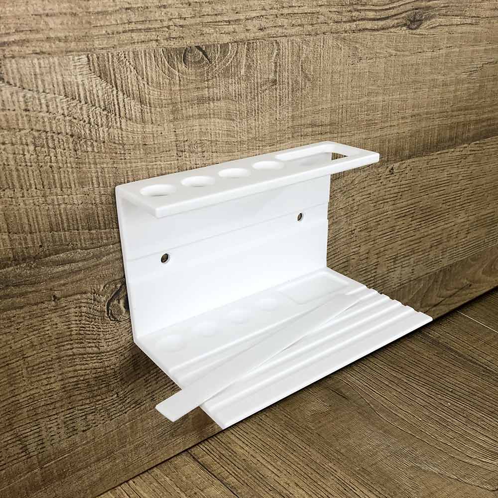 Vyberte si tento držák na zubní kartáčky, pastu a mýdlo o tloušťce 6 mm jako koupelnový doplněk pro moderní a luxusní atmosféru zcela vyrobenou z materiálu Corian, hygienického materiálu se základními liniemi.