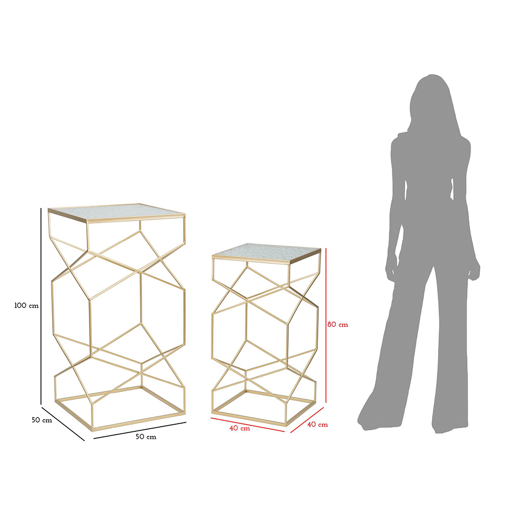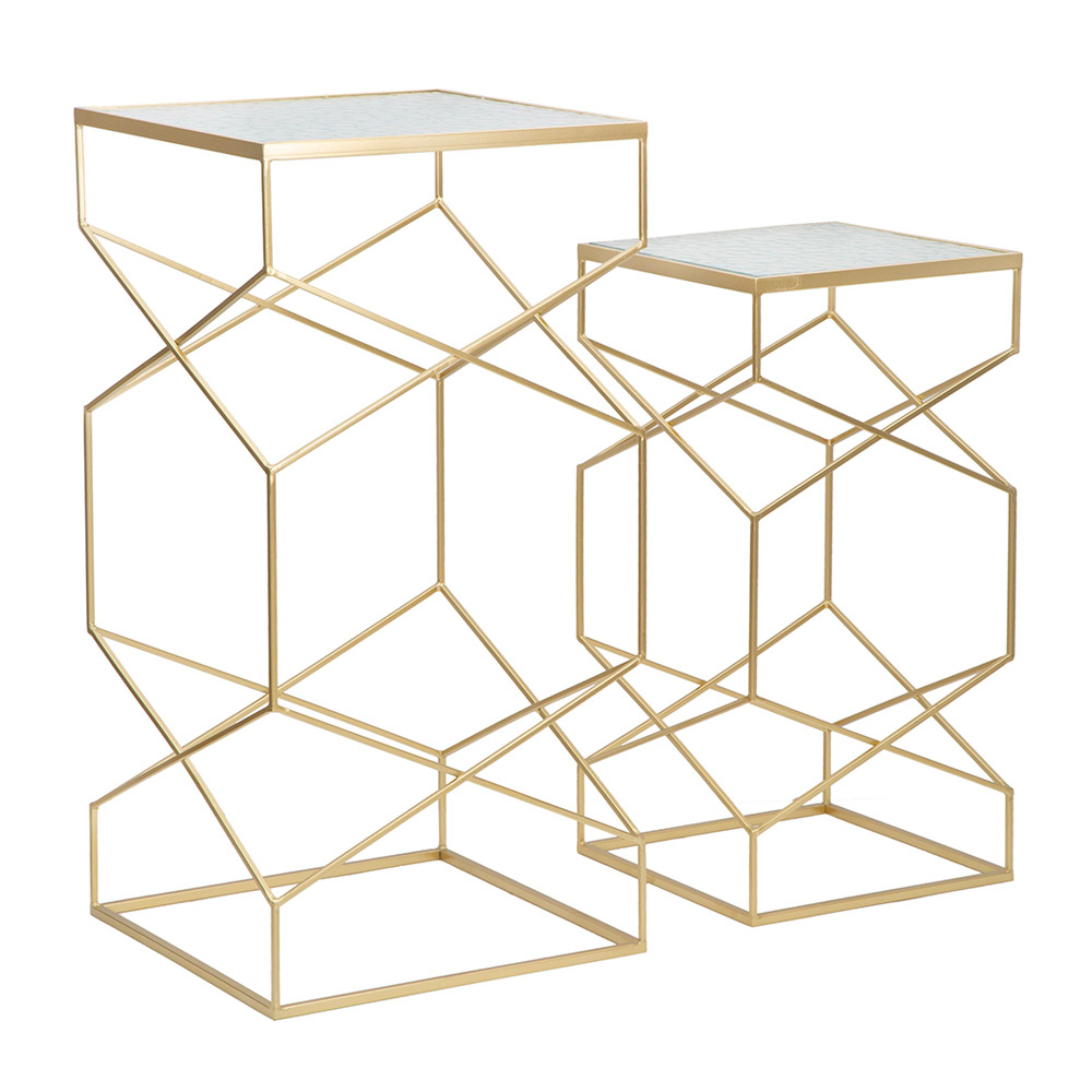 2 čtvercové telefonní stolky ze zlatého železa s geometrickými liniemi, které vytvářejí dojem hloubky, doplněné jemně zpracovanou skleněnou deskou.