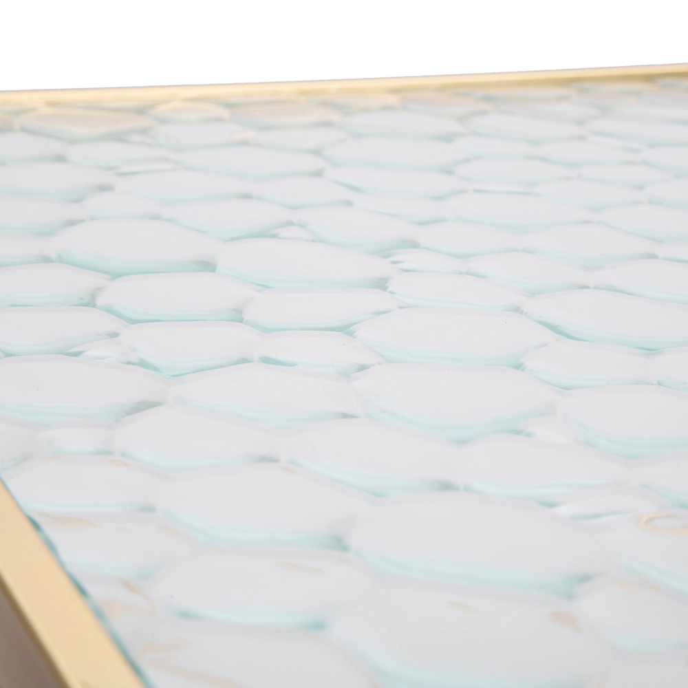 Tyto konferenční stolky jsou skutečnými designovými klenoty, které spojují uměleckou jemnost se strukturální pevností . Jejich zlatý kovový základ tvoří mřížku geometrických linií, které se prolínají ve vizuálním baletu tvarů a objemů a vytvářejí trojrozměrný efekt, který je téměř sochařský.